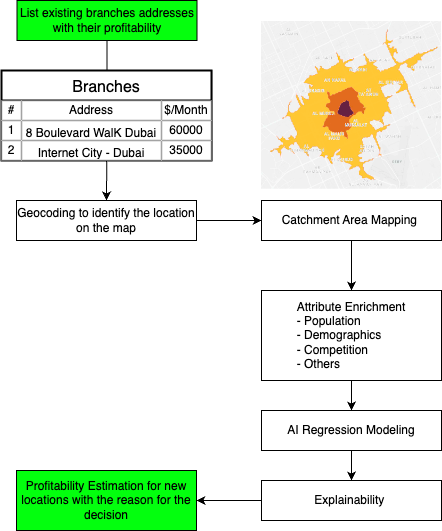 Step 7: Profitability Estimation: For the proposed new location, input the catchment area attributes into the regression model to estimate its potential profitability.