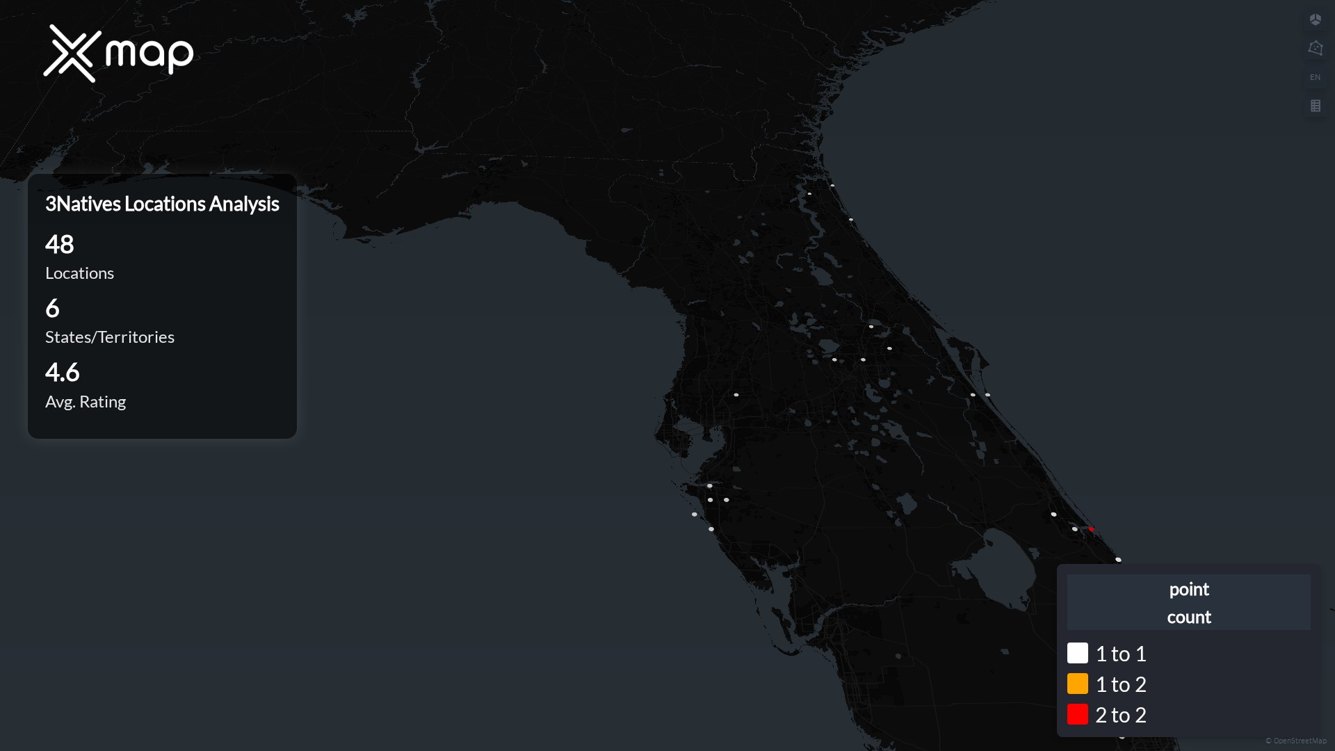 Street-level clusters show corridors where multiple 3Natives locations sit within the same neighborhood indicating strong local presence and coherence. 3Natives operates a total of 48 nationwide.