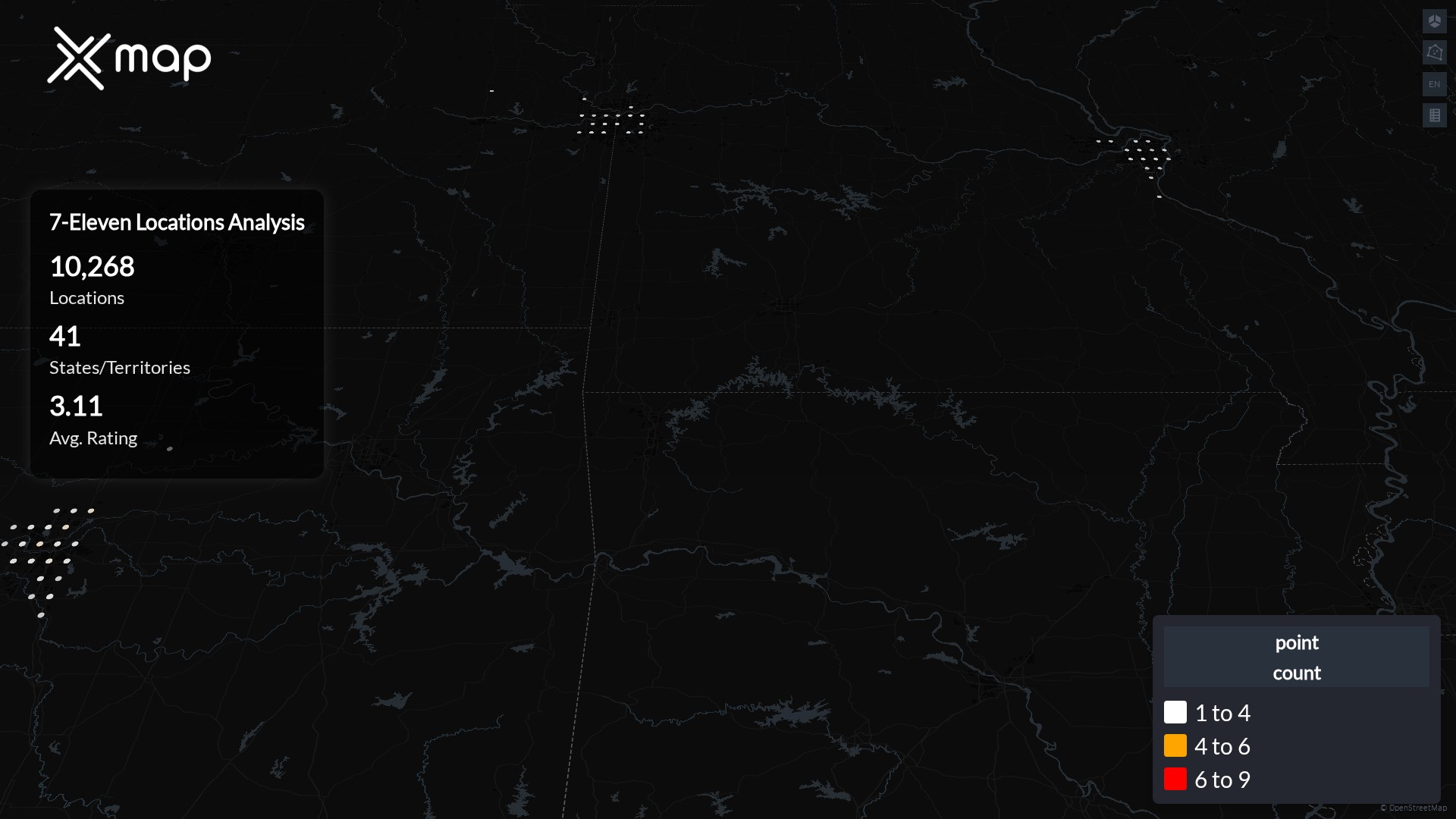 Street-level clusters show corridors where multiple 7-Eleven locations sit within the same neighborhood indicating strong local presence and coherence. 7-Eleven operates a total of 10268 nationwide.