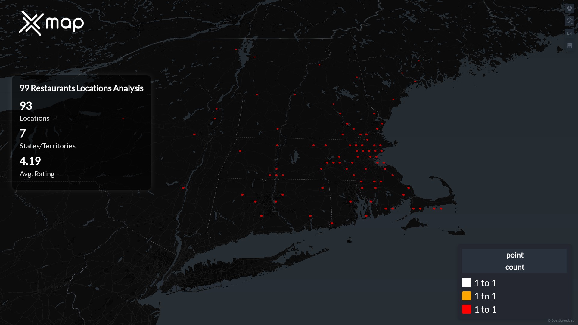 99 Restaurants POI data enables clear measurement of footprint and demand. Analysts can rank states and cities by location count, compare coverage on a per-capita basis, and use traffic scores and review volumes to spot high-performing markets and under-served pockets. The result is an objective view of saturation, growth opportunities, and performance outliers.