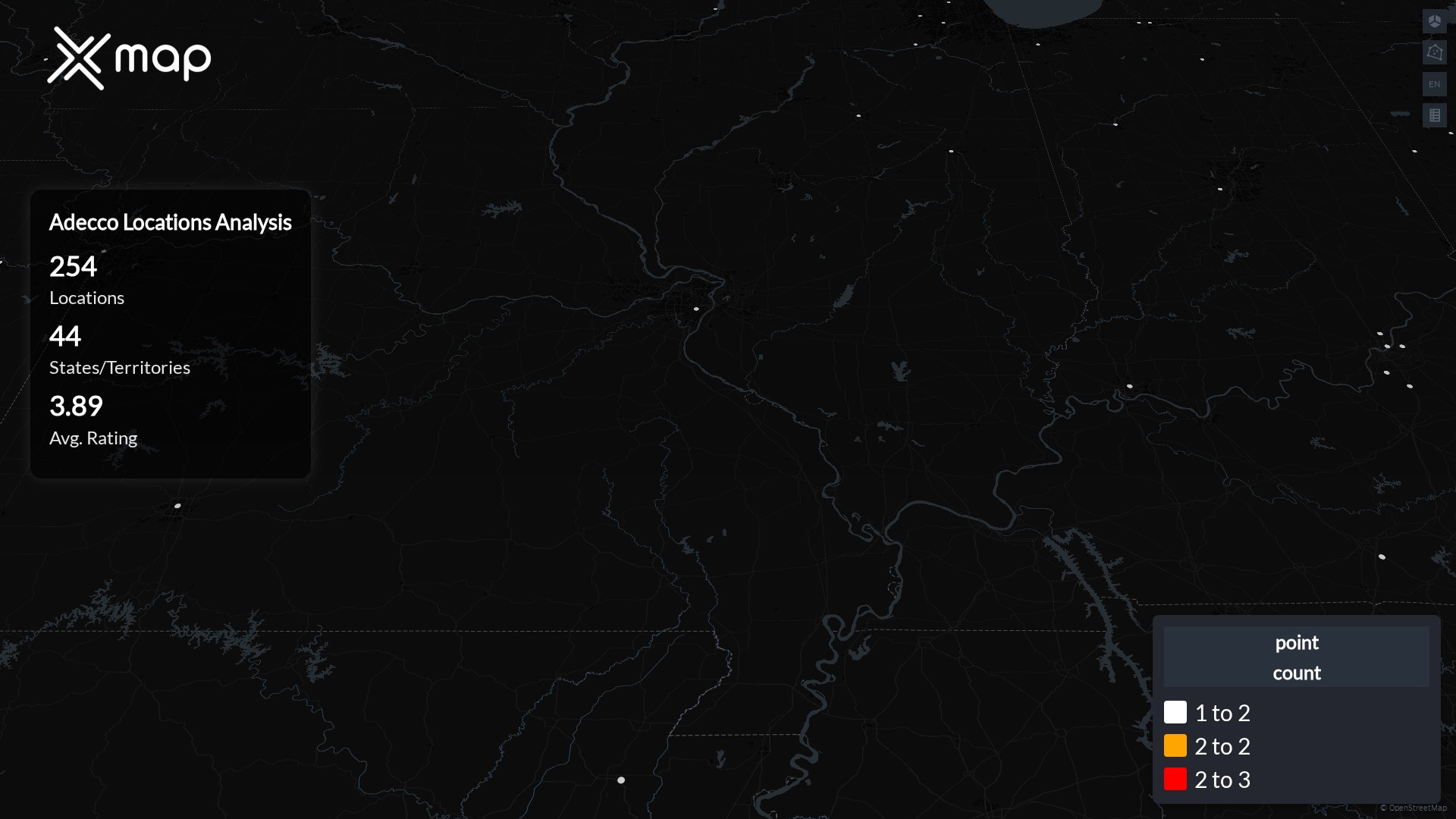 Adecco POI data enables clear measurement of footprint and demand. Analysts can rank states and cities by location count, compare coverage on a per-capita basis, and use traffic scores and review volumes to spot high-performing markets and under-served pockets. The result is an objective view of saturation, growth opportunities, and performance outliers.