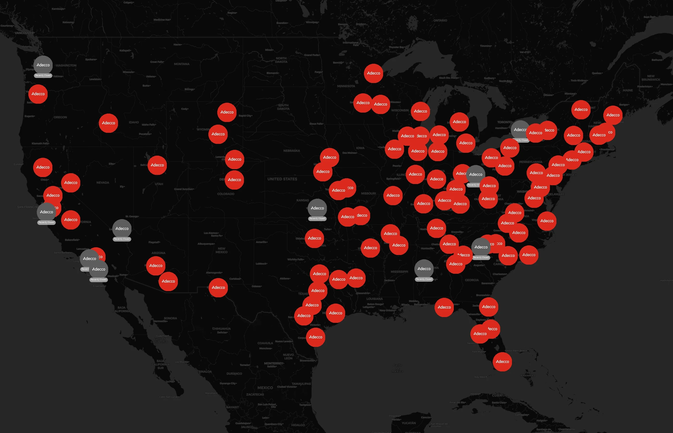 Street-level clusters show corridors where multiple Adecco locations sit within the same neighborhood indicating strong local presence and coherence. Adecco operates a total of 254 nationwide.