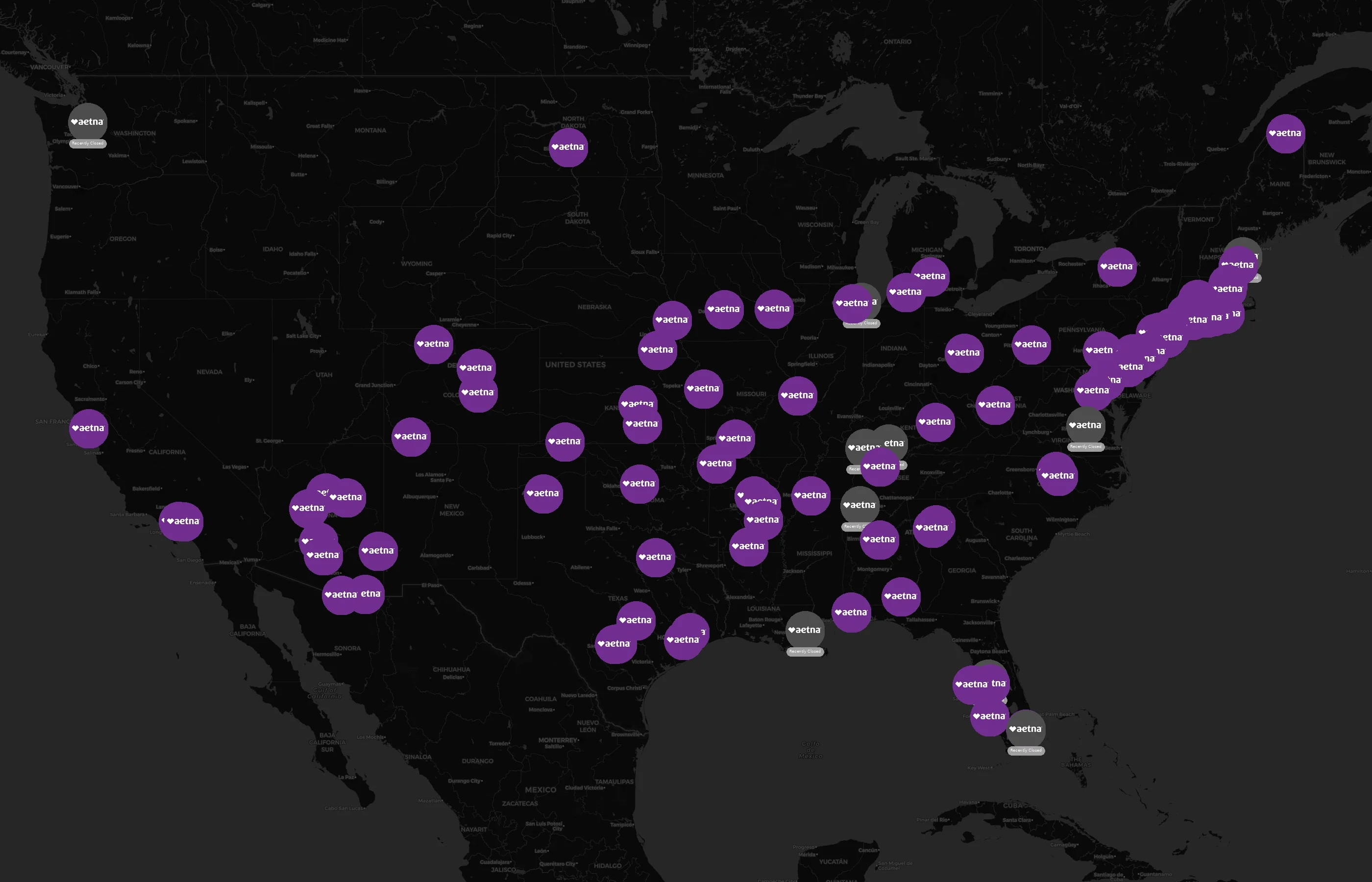Street-level clusters show corridors where multiple Aetna locations sit within the same neighborhood indicating strong local presence and coherence. Aetna operates a total of 104 nationwide.