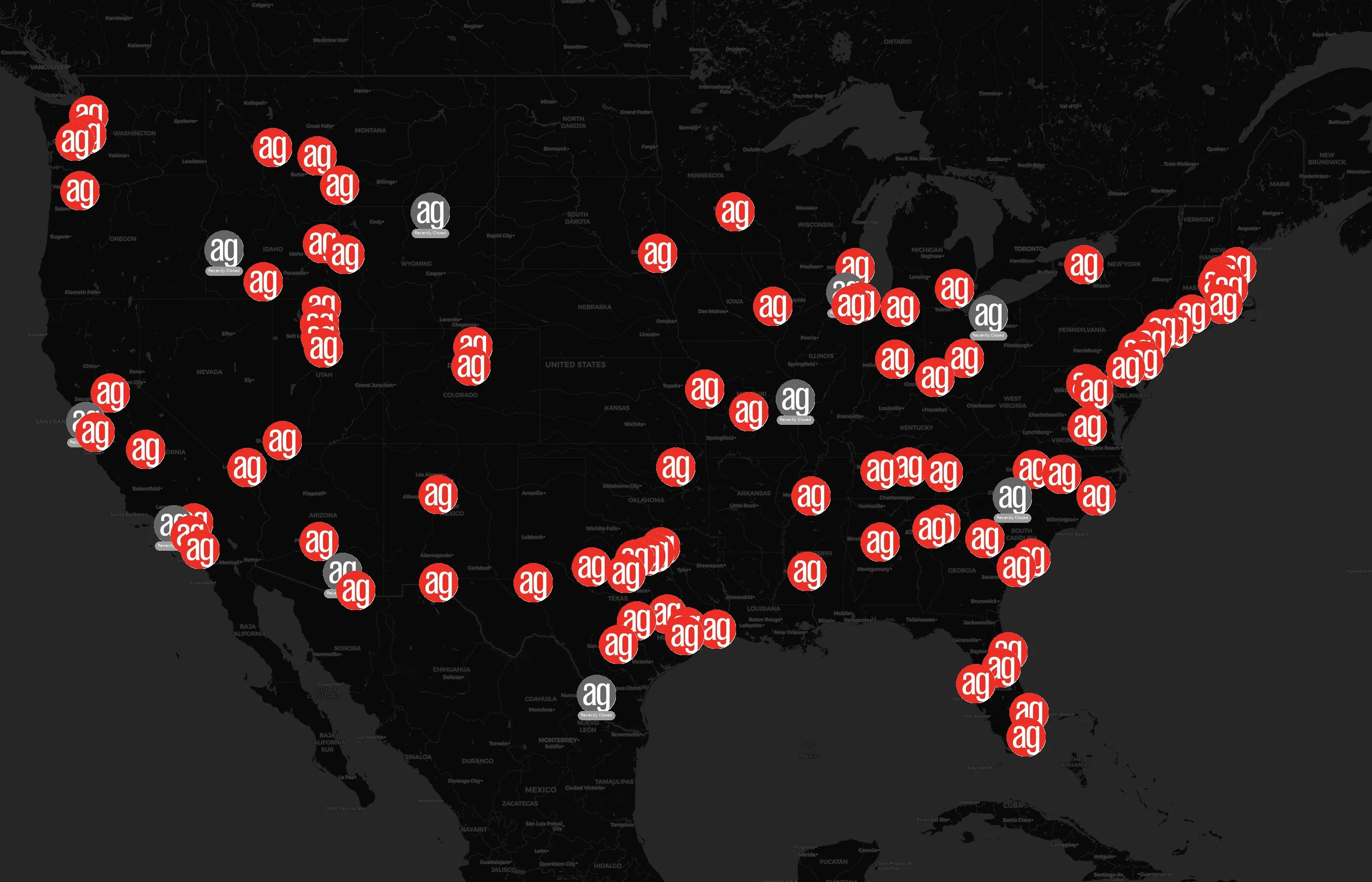 Locations concentrate around major metros such as Dallas, Harris, Maricopa, Cook, and SaltLake. The top 10 cities account for 27.4% of U.S. sites.