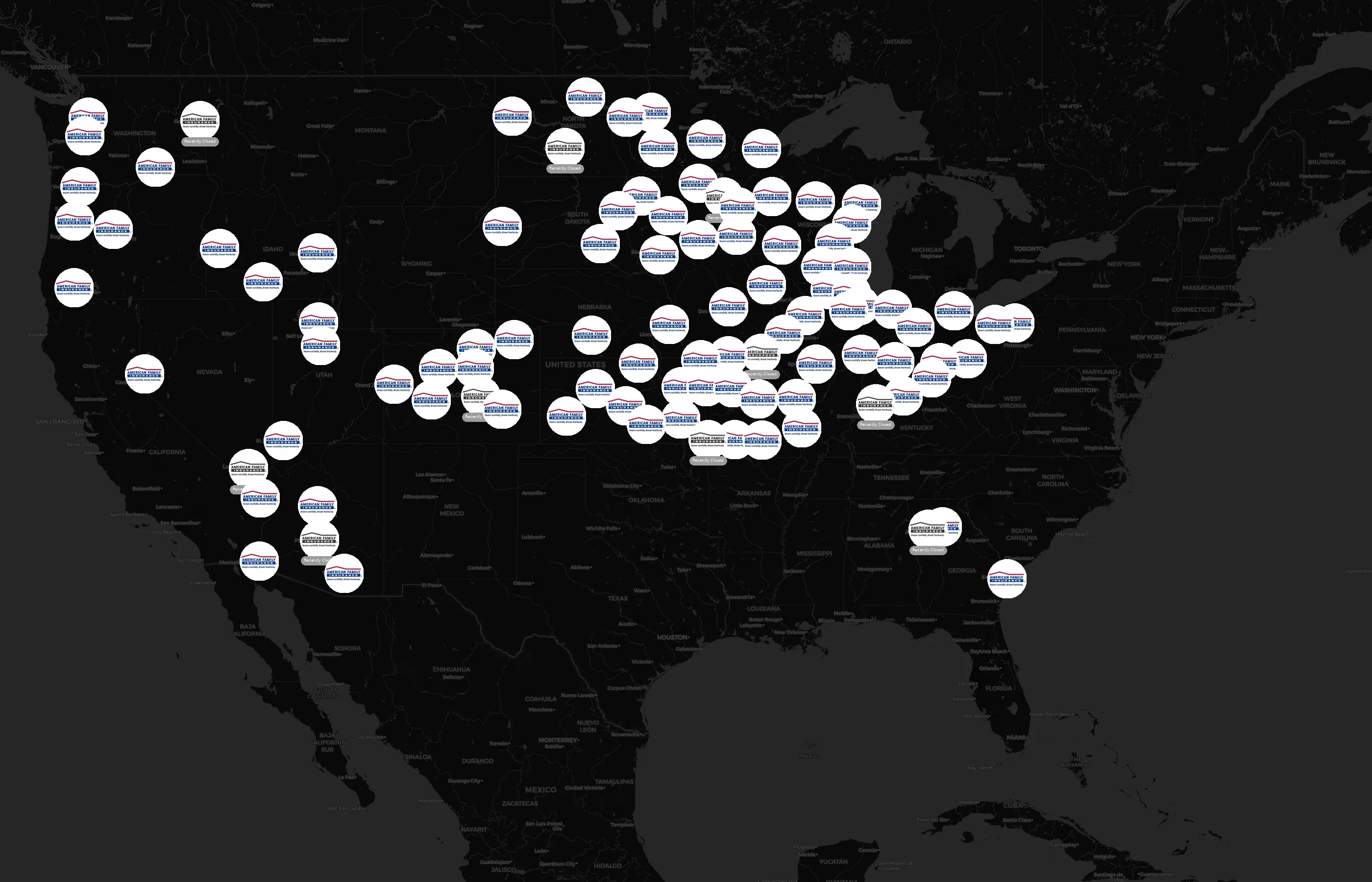 Street-level clusters show corridors where multiple American Family Insurance locations sit within the same neighborhood indicating strong local presence and coherence. American Family Insurance operates a total of 2084 nationwide.