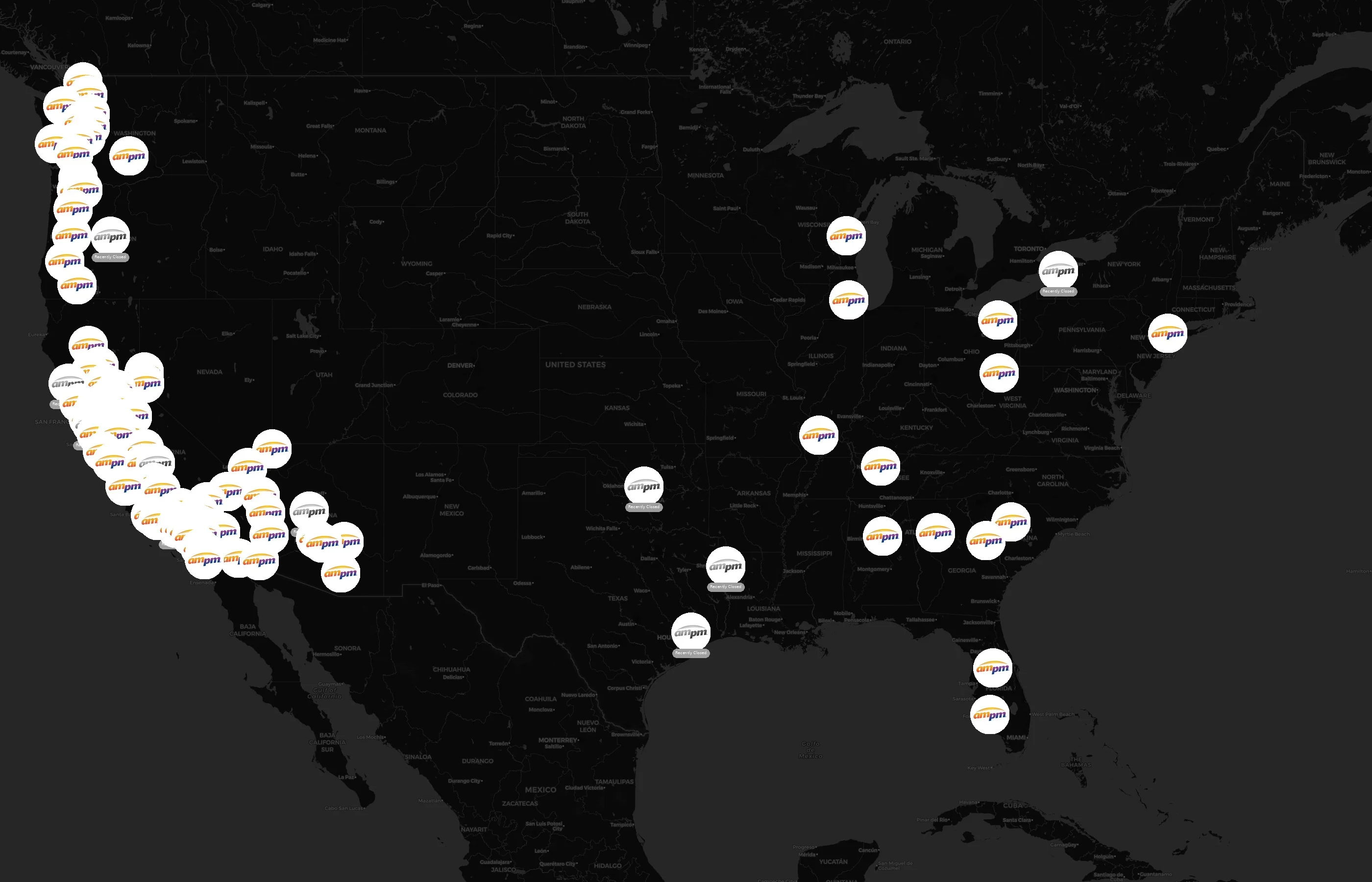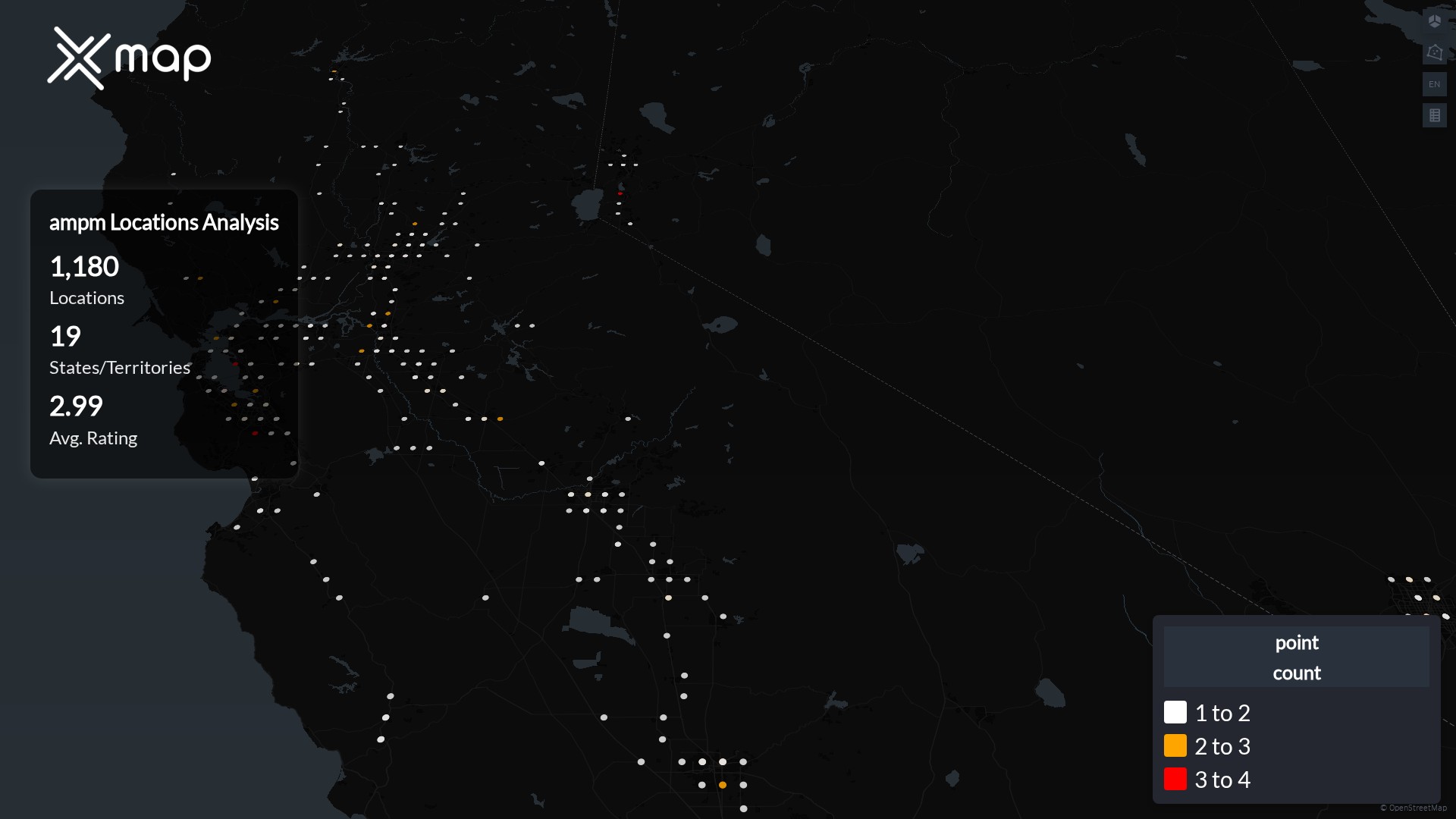 Street-level clusters show corridors where multiple ampm locations sit within the same neighborhood indicating strong local presence and coherence. ampm operates a total of 1180 nationwide.