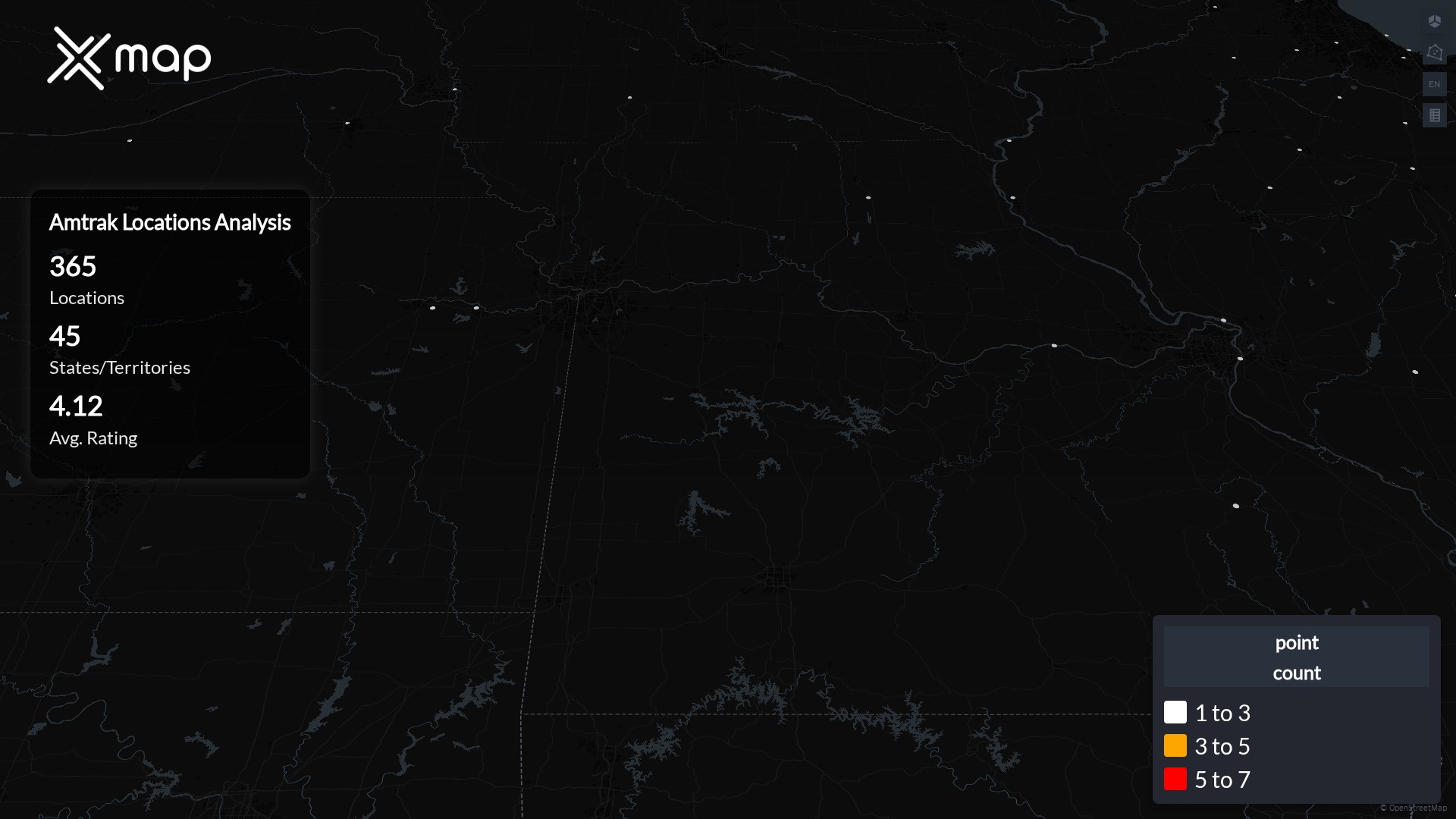 Street-level clusters show corridors where multiple Amtrak locations sit within the same neighborhood indicating strong local presence and coherence. Amtrak operates a total of 365 nationwide.