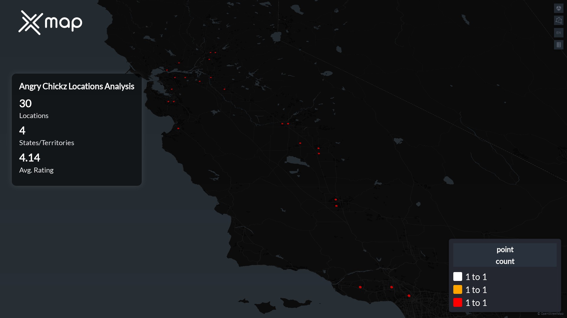 Angry Chickz POI data enables clear measurement of footprint and demand. Analysts can rank states and cities by location count, compare coverage on a per-capita basis, and use traffic scores and review volumes to spot high-performing markets and under-served pockets. The result is an objective view of saturation, growth opportunities, and performance outliers.