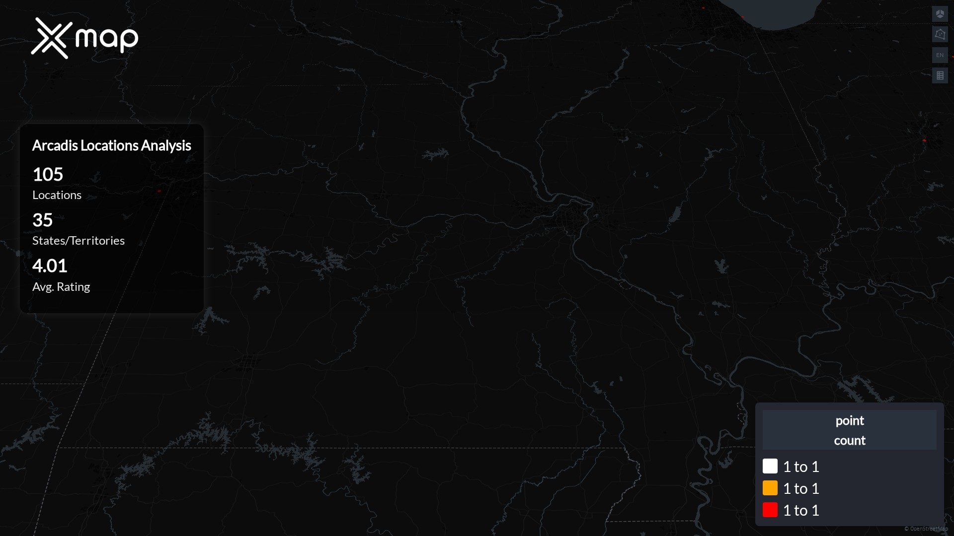 Street-level clusters show corridors where multiple Arcadis locations sit within the same neighborhood indicating strong local presence and coherence. Arcadis operates a total of 105 nationwide.