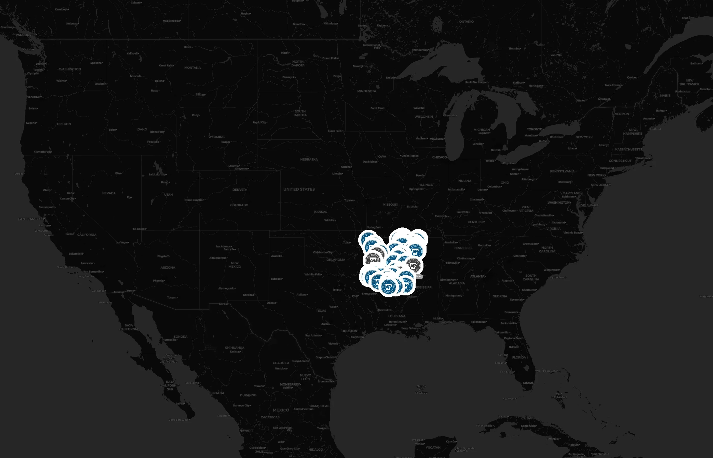 Locations concentrate around major metros such as Union, Sharp, Craighead, Poinsett, and LittleRiver. The top 10 cities account for 54.2% of U.S. sites.