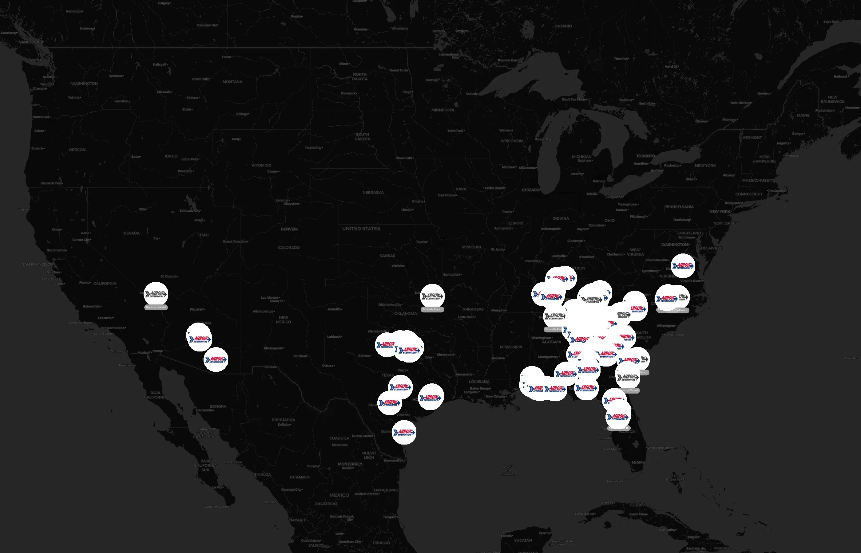 Street-level clusters show corridors where multiple Arrow Exterminators locations sit within the same neighborhood indicating strong local presence and coherence. Arrow Exterminators operates a total of 115 nationwide.