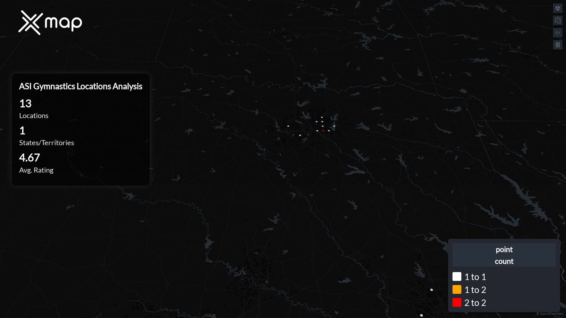 Street-level clusters show corridors where multiple ASI Gymnastics locations sit within the same neighborhood indicating strong local presence and coherence. ASI Gymnastics operates a total of 13 nationwide.