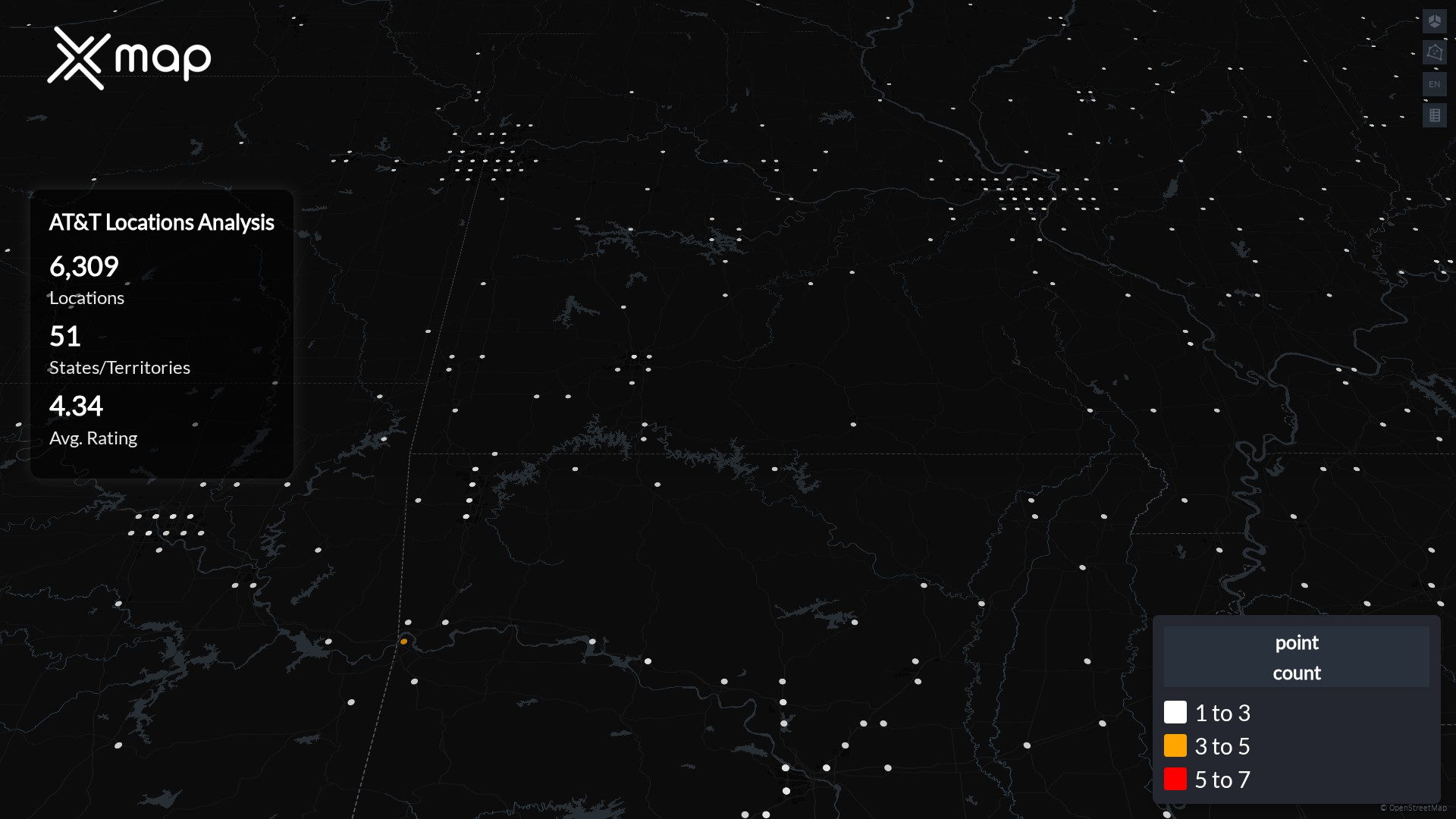 AT&T POI data enables clear measurement of footprint and demand. Analysts can rank states and cities by location count, compare coverage on a per-capita basis, and use traffic scores and review volumes to spot high-performing markets and under-served pockets. The result is an objective view of saturation, growth opportunities, and performance outliers.