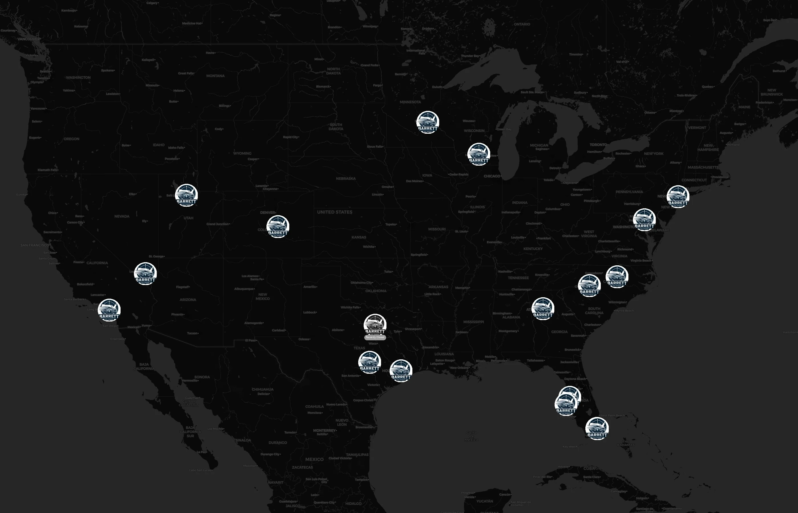 Street-level clusters show corridors where multiple Barrett Car Shipping locations sit within the same neighborhood indicating strong local presence and coherence. Barrett Car Shipping operates a total of 18 nationwide.