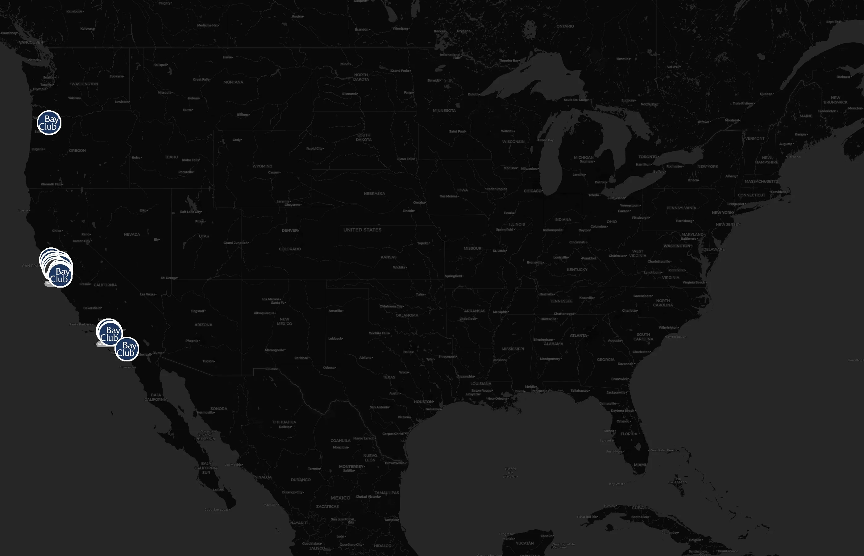 Street-level clusters show corridors where multiple Bay Club locations sit within the same neighborhood indicating strong local presence and coherence. Bay Club operates a total of 23 nationwide.