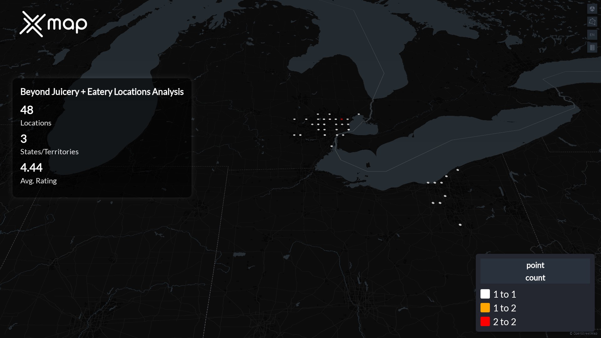 Street-level clusters show corridors where multiple Beyond Juicery + Eatery locations sit within the same neighborhood indicating strong local presence and coherence. Beyond Juicery + Eatery operates a total of 48 nationwide.