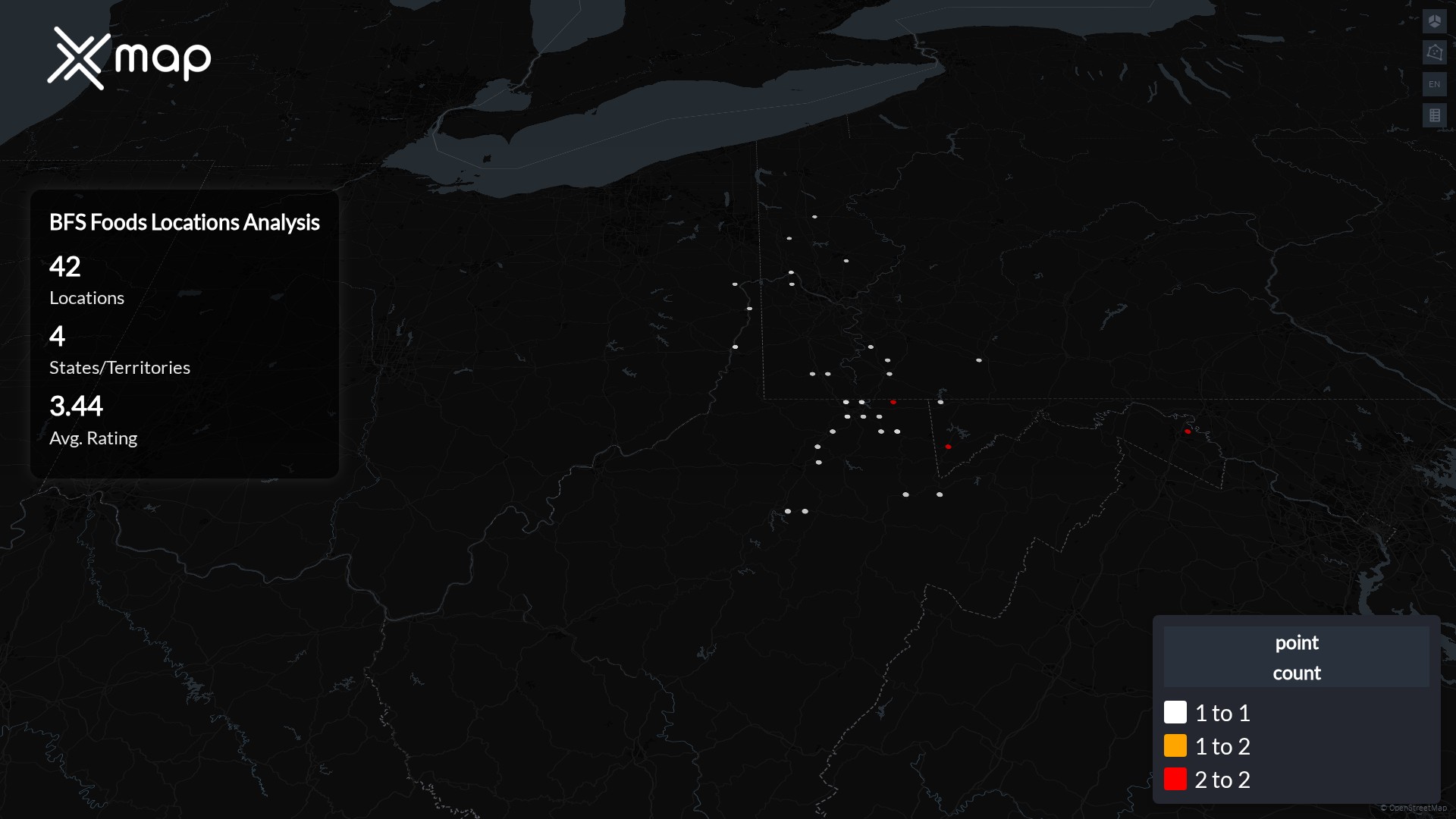 BFS Foods POI data enables clear measurement of footprint and demand. Analysts can rank states and cities by location count, compare coverage on a per-capita basis, and use traffic scores and review volumes to spot high-performing markets and under-served pockets. The result is an objective view of saturation, growth opportunities, and performance outliers.