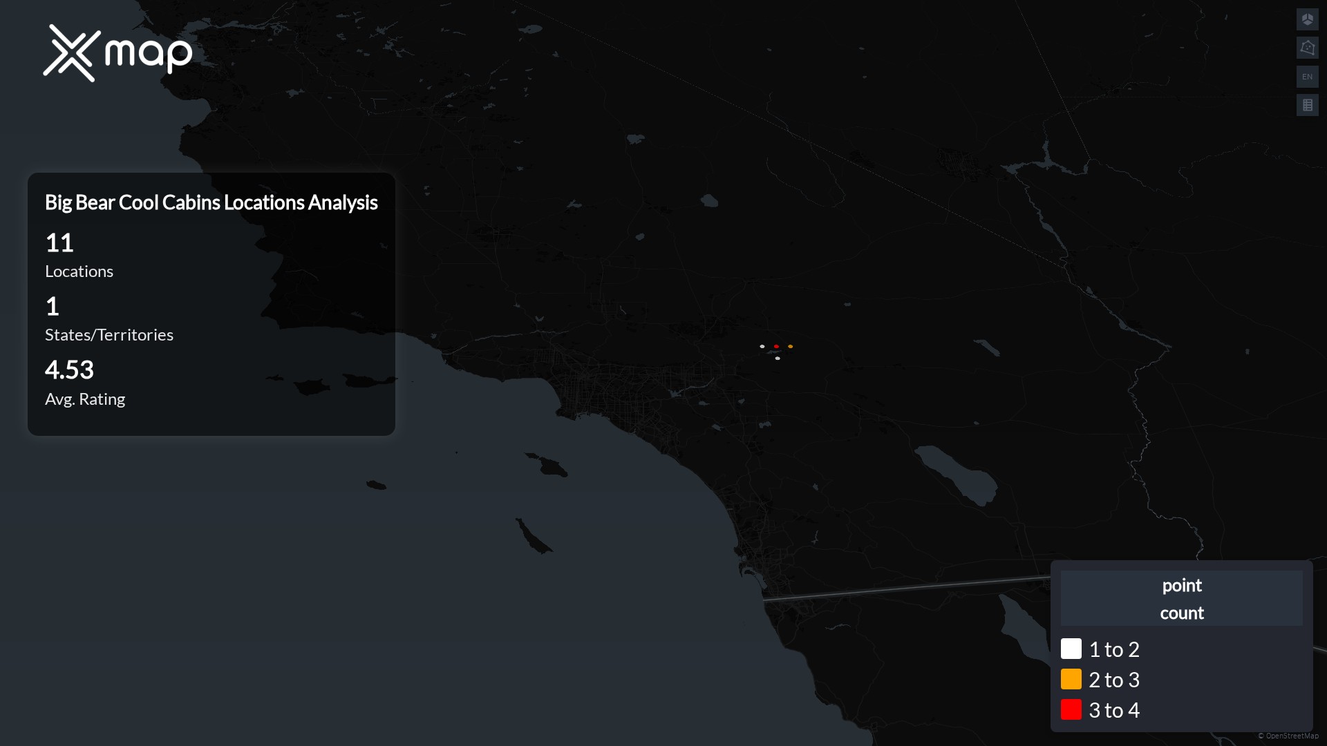 Big Bear Cool Cabins operates 11 United States of America locations across 1 states. Largest clusters are in California; the top 10 states contain 100.0% of sites. Coverage is thinner in California.