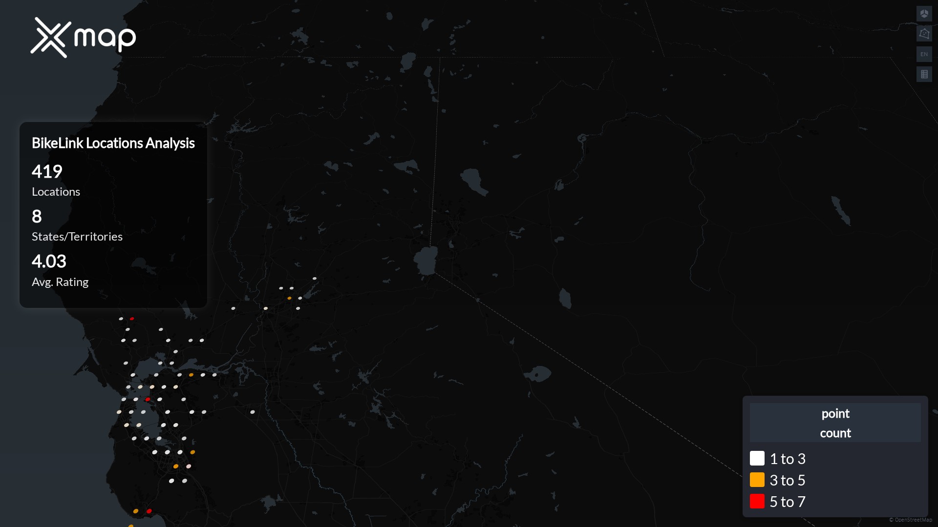 BikeLink POI data enables clear measurement of footprint and demand. Analysts can rank states and cities by location count, compare coverage on a per-capita basis, and use traffic scores and review volumes to spot high-performing markets and under-served pockets. The result is an objective view of saturation, growth opportunities, and performance outliers.
