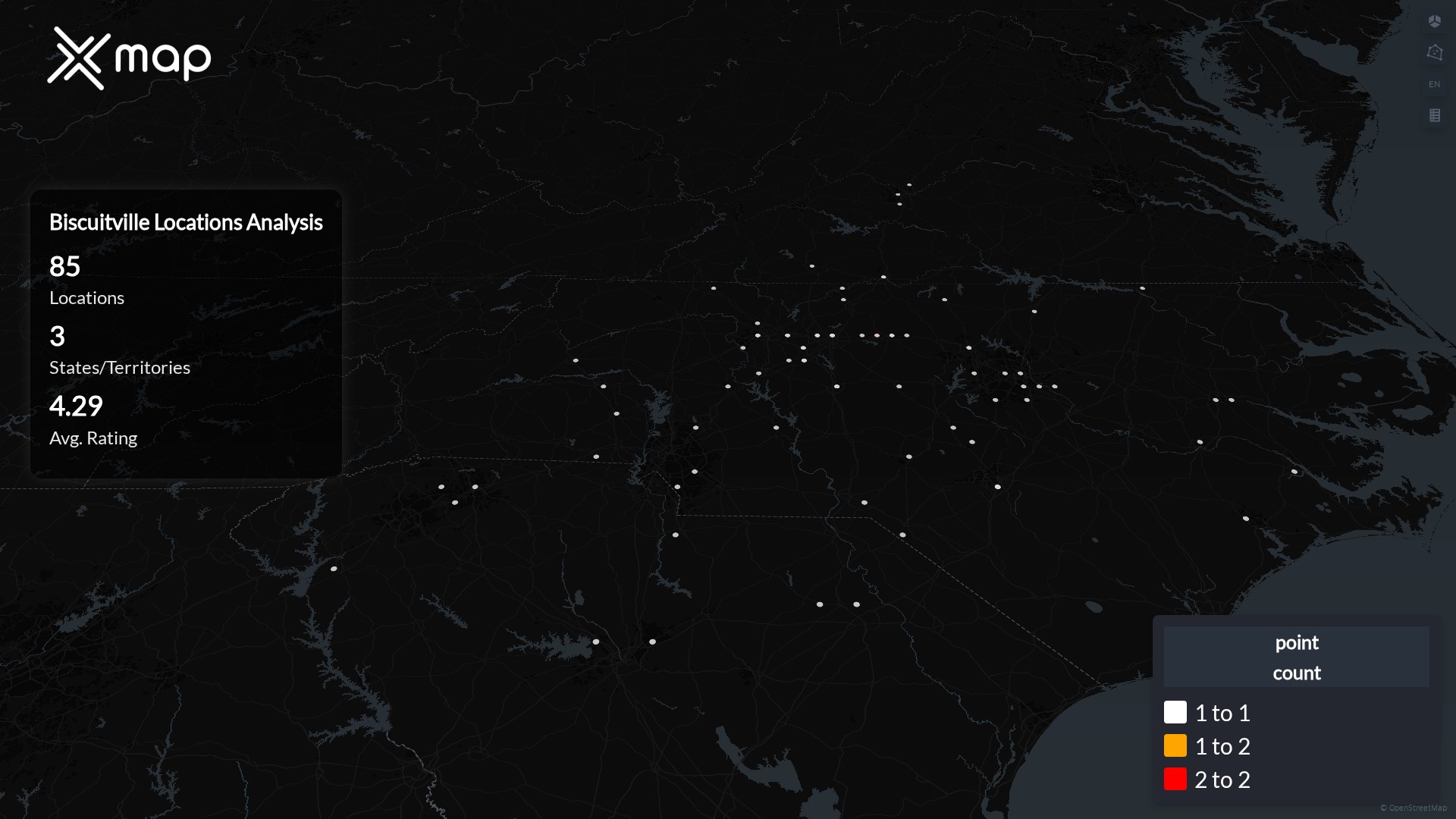 Biscuitville POI data enables clear measurement of footprint and demand. Analysts can rank states and cities by location count, compare coverage on a per-capita basis, and use traffic scores and review volumes to spot high-performing markets and under-served pockets. The result is an objective view of saturation, growth opportunities, and performance outliers.