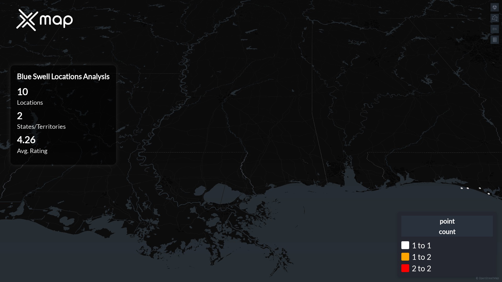 Street-level clusters show corridors where multiple Blue Swell locations sit within the same neighborhood indicating strong local presence and coherence. Blue Swell operates a total of 10 nationwide.