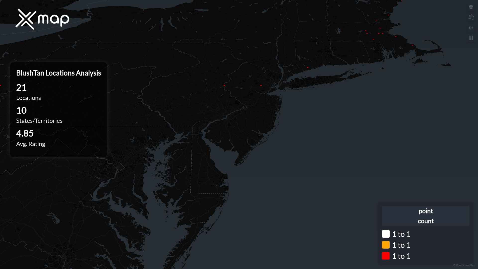 Street-level clusters show corridors where multiple BlushTan locations sit within the same neighborhood indicating strong local presence and coherence. BlushTan operates a total of 21 nationwide.