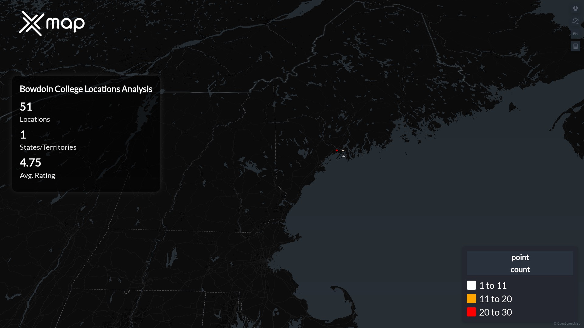 Bowdoin College operates 51 United States of America locations across 1 states. Largest clusters are in Maine; the top 10 states contain 100.0% of sites. Coverage is thinner in Maine.