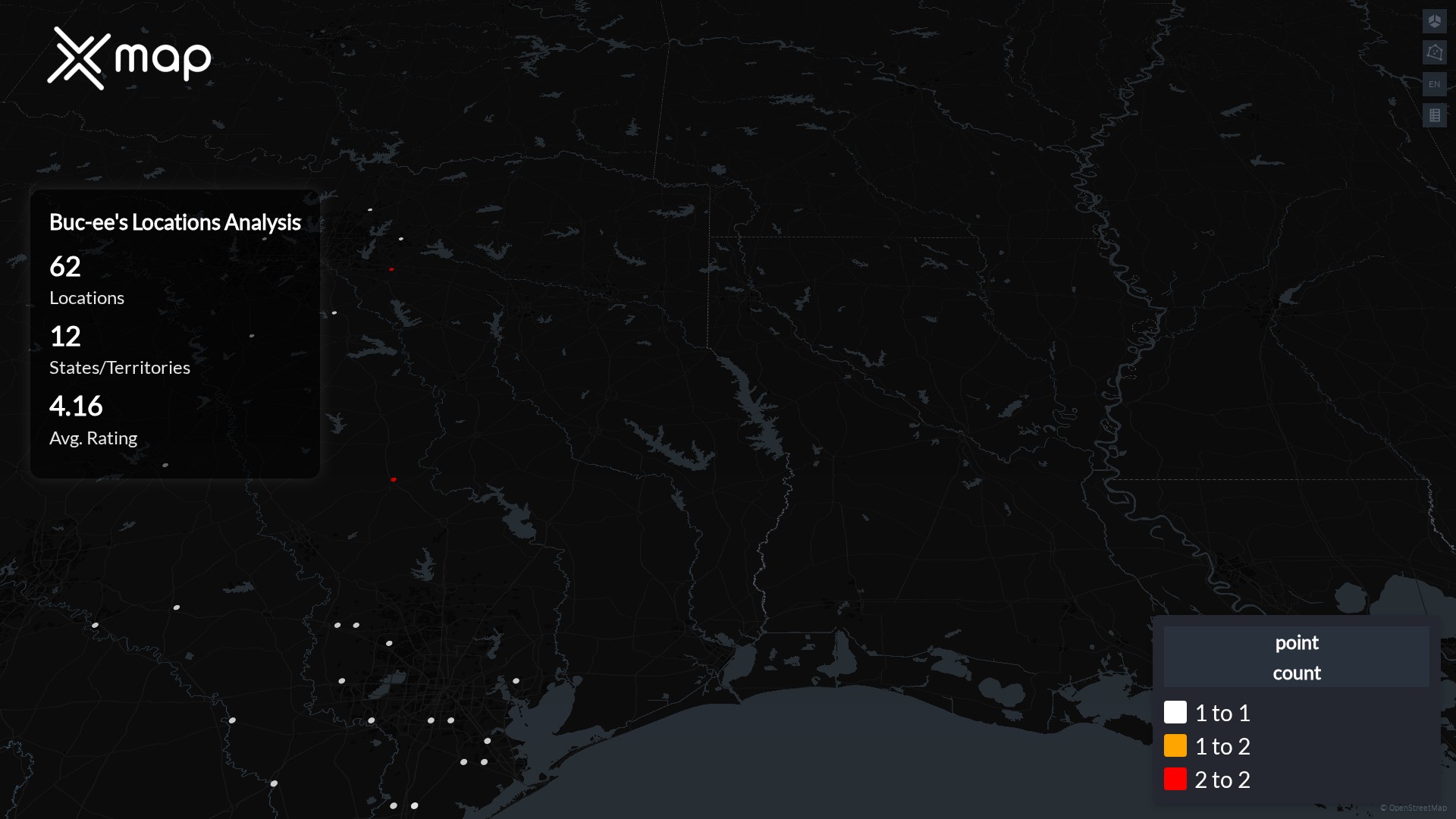 Street-level clusters show corridors where multiple Buc-ee's locations sit within the same neighborhood indicating strong local presence and coherence. Buc-ee's operates a total of 62 nationwide.