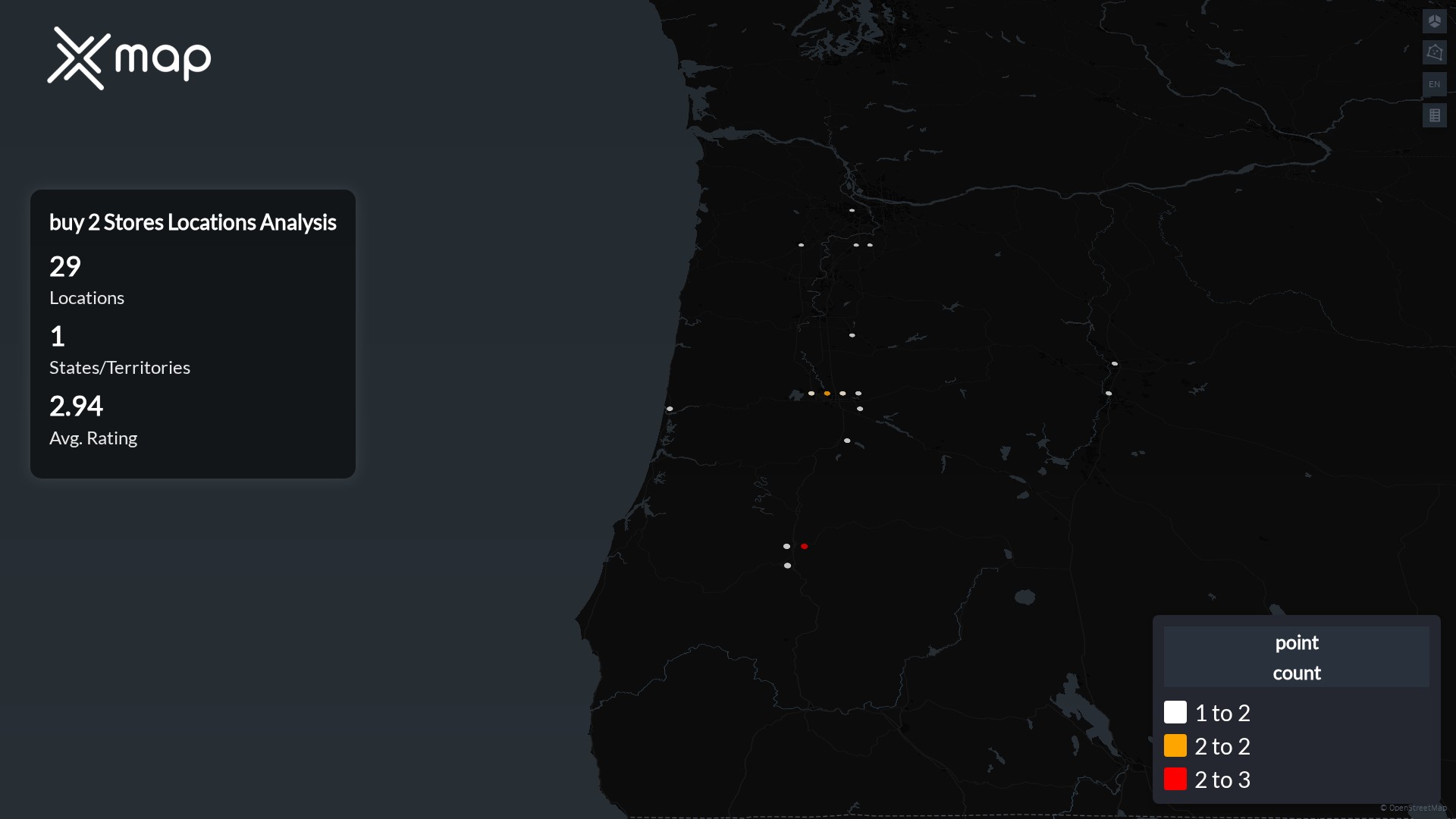 buy 2 Stores operates 29 United States of America locations across 1 states. Largest clusters are in Oregon; the top 10 states contain 100.0% of sites. Coverage is thinner in Oregon.