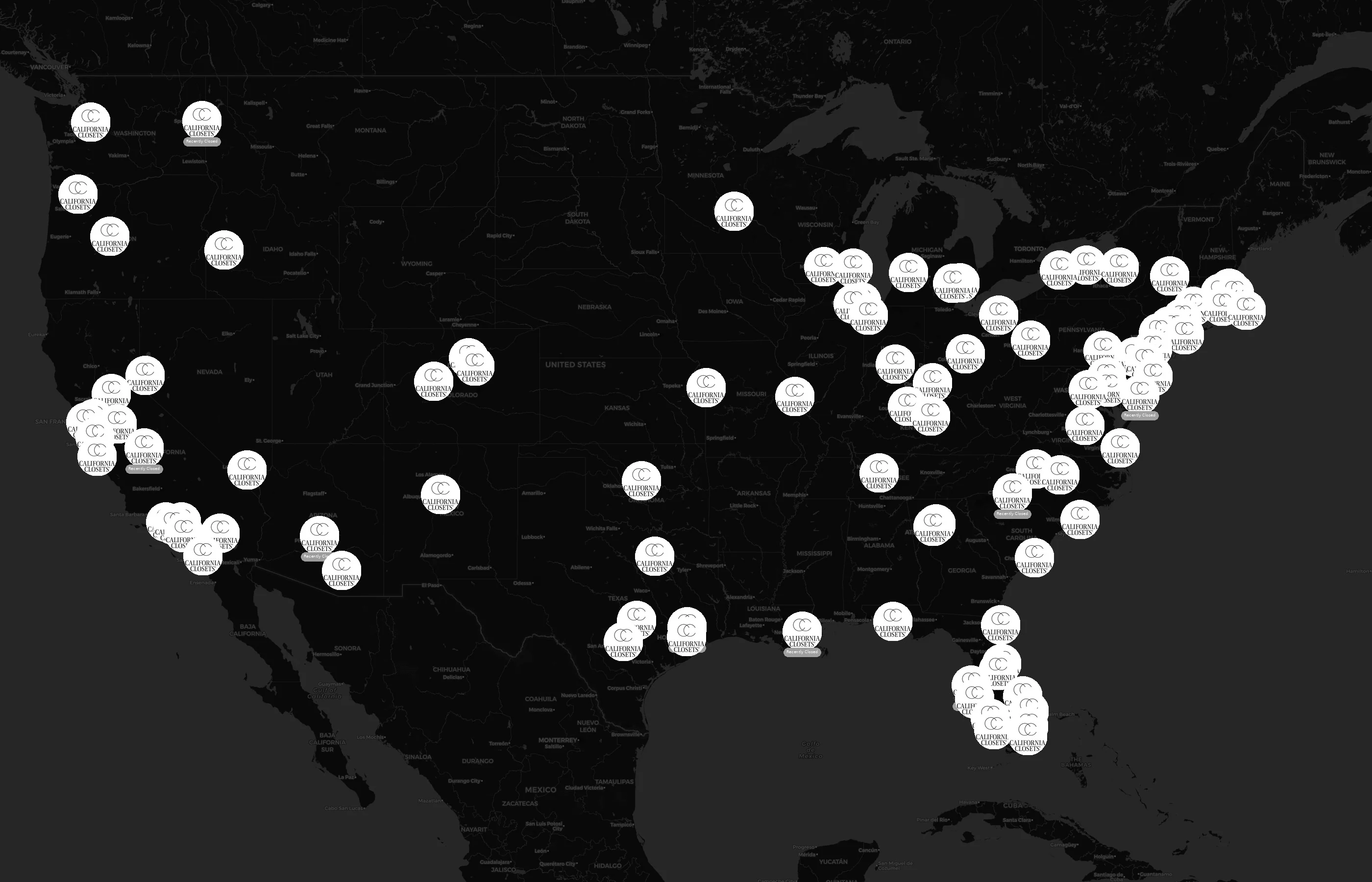 Street-level clusters show corridors where multiple California Closets locations sit within the same neighborhood indicating strong local presence and coherence. California Closets operates a total of 158 nationwide.