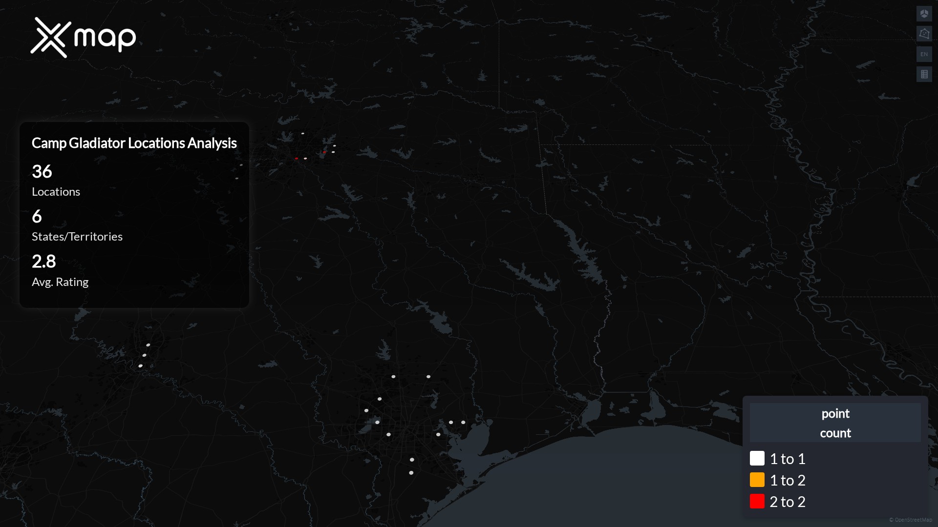 Camp Gladiator POI data enables clear measurement of footprint and demand. Analysts can rank states and cities by location count, compare coverage on a per-capita basis, and use traffic scores and review volumes to spot high-performing markets and under-served pockets. The result is an objective view of saturation, growth opportunities, and performance outliers.