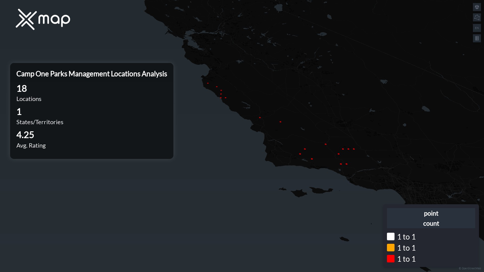 Camp One Parks Management operates 18 United States of America locations across 1 states. Largest clusters are in California; the top 10 states contain 100.0% of sites. Coverage is thinner in California.