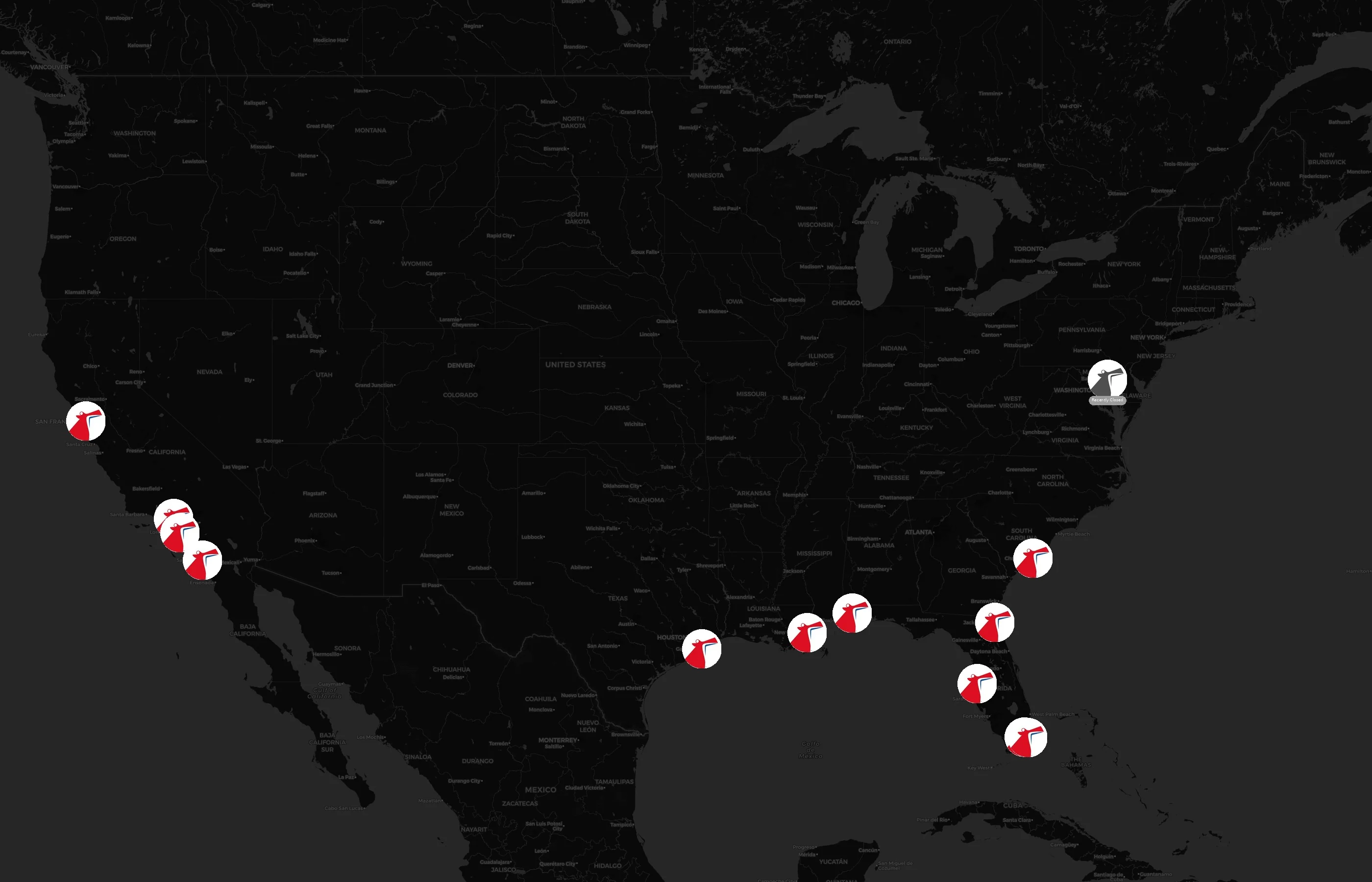 Locations concentrate around major metros such as Miami-Dade, Orleans, LosAngeles, Duval, and Charleston. The top 10 cities account for 88.9% of U.S. sites.