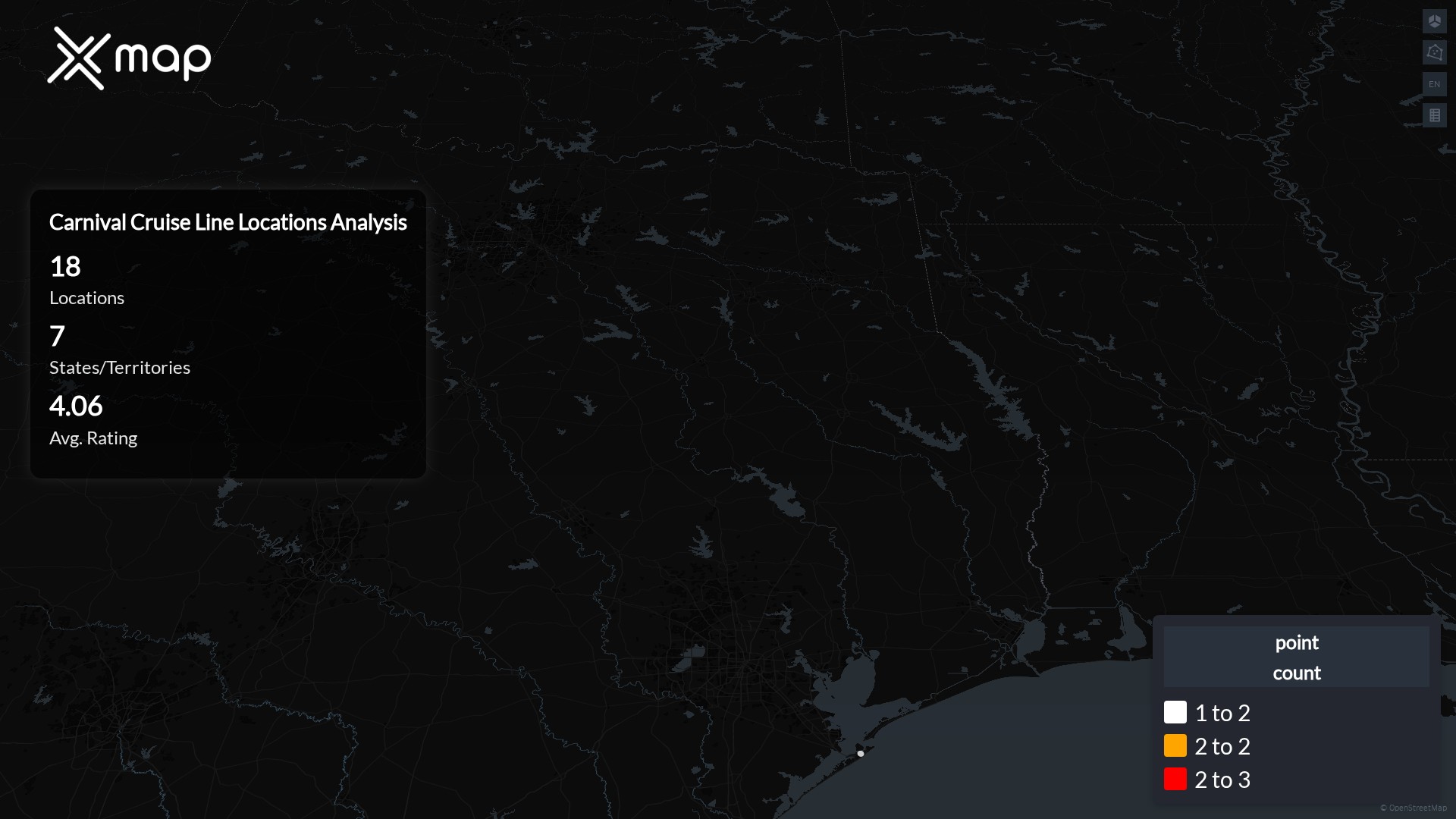 Carnival Cruise Line POI data enables clear measurement of footprint and demand. Analysts can rank states and cities by location count, compare coverage on a per-capita basis, and use traffic scores and review volumes to spot high-performing markets and under-served pockets. The result is an objective view of saturation, growth opportunities, and performance outliers.