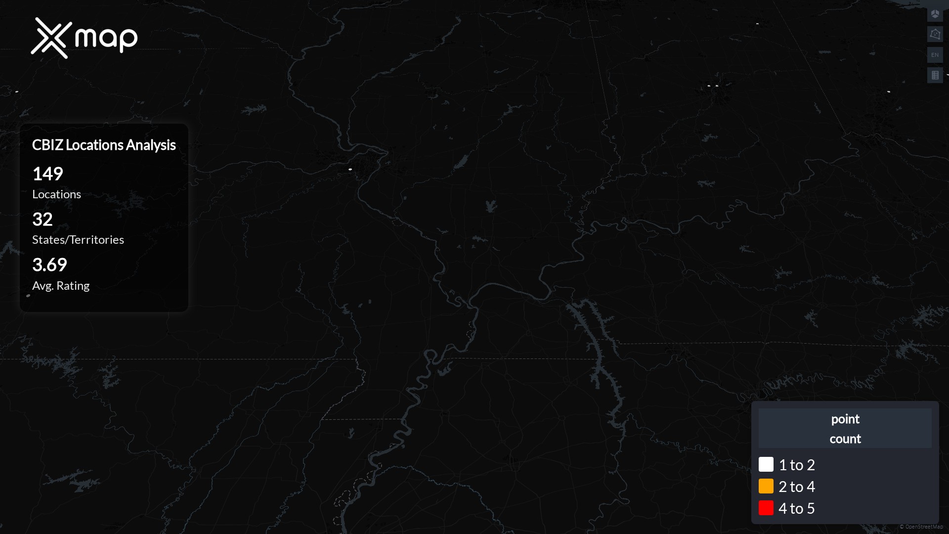 Street-level clusters show corridors where multiple CBIZ locations sit within the same neighborhood indicating strong local presence and coherence. CBIZ operates a total of 149 nationwide.