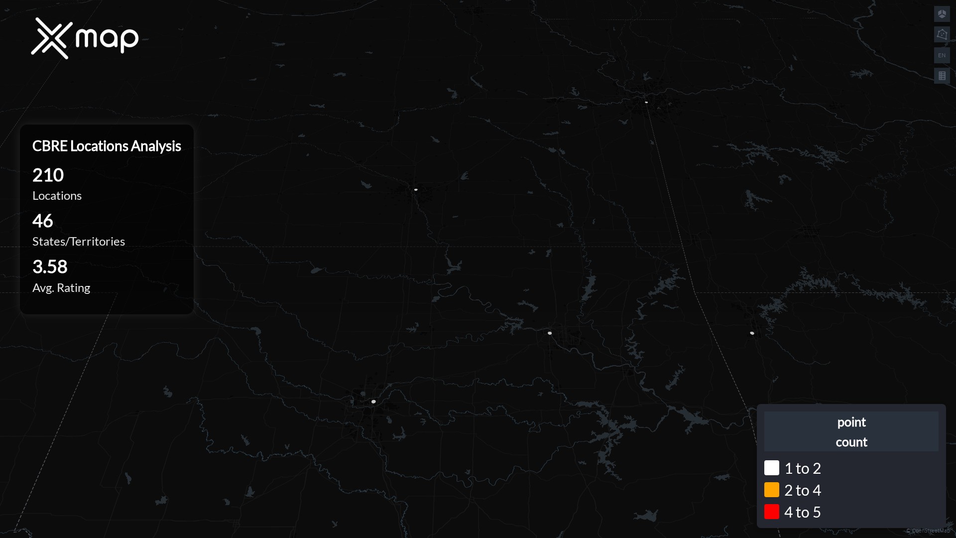Street-level clusters show corridors where multiple CBRE locations sit within the same neighborhood indicating strong local presence and coherence. CBRE operates a total of 210 nationwide.