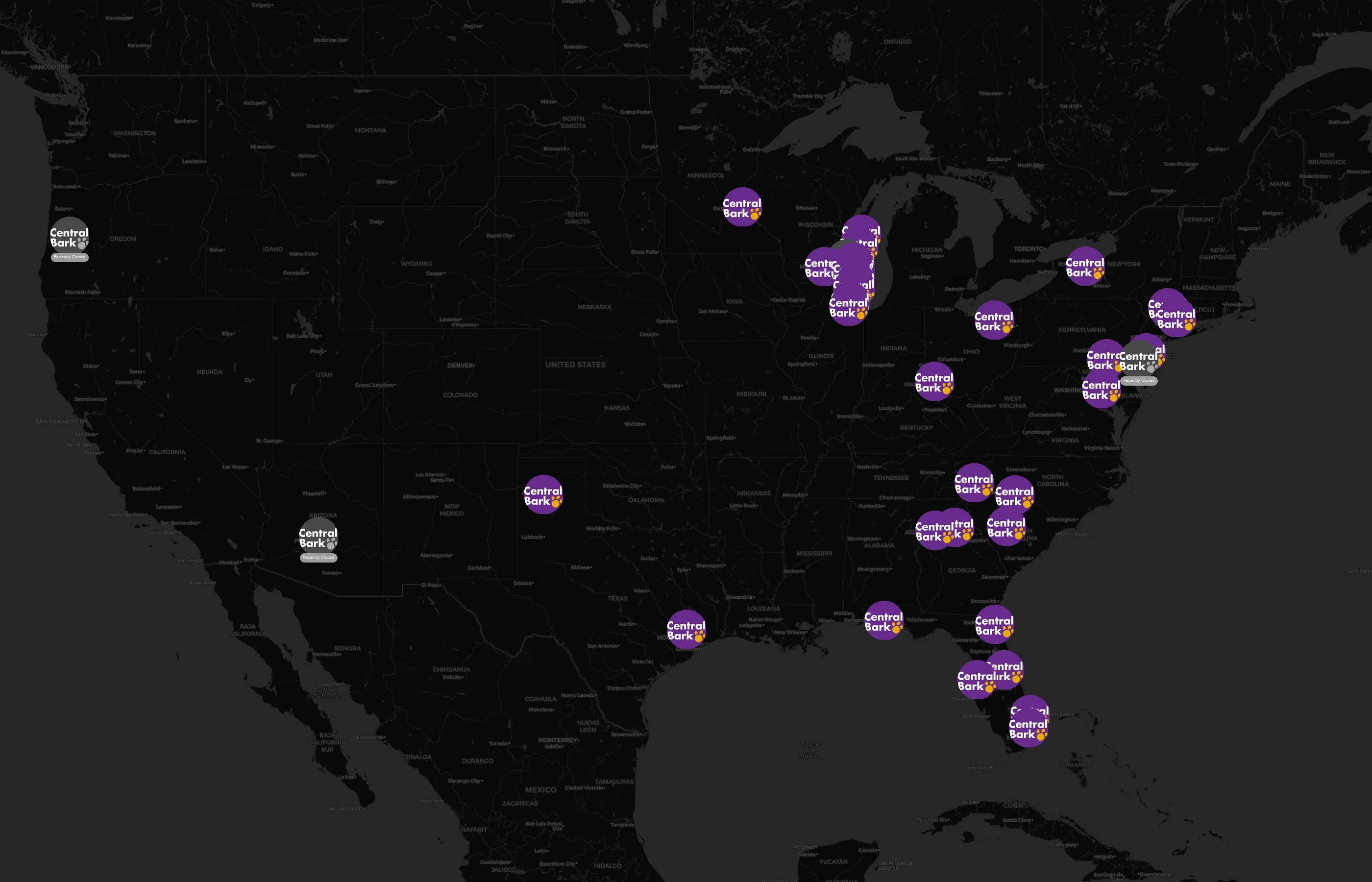 Street-level clusters show corridors where multiple Central Bark locations sit within the same neighborhood indicating strong local presence and coherence. Central Bark operates a total of 43 nationwide.