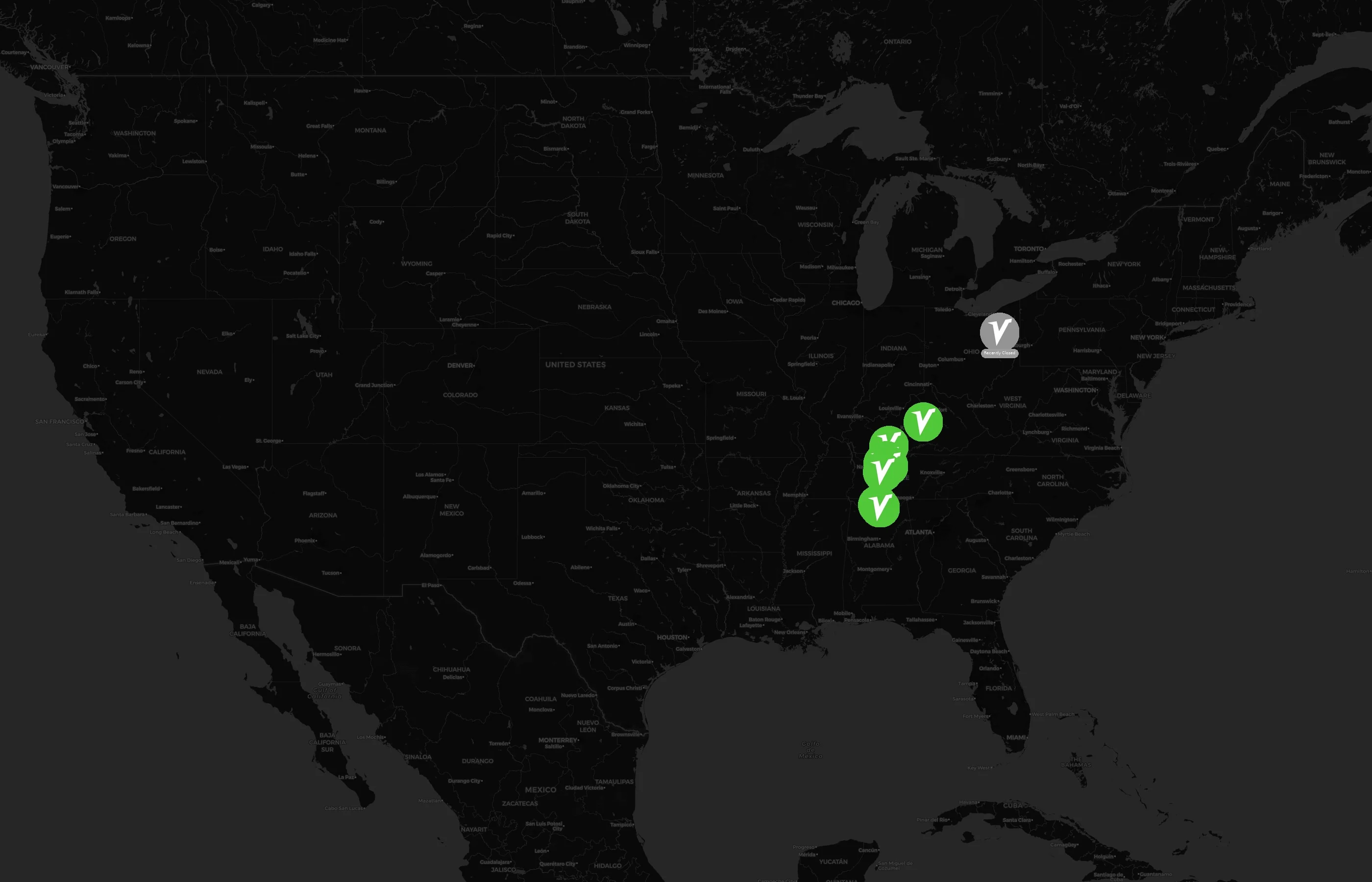 CheerVille has a total of 10 locations across four states in the United States of America. Tennessee has the highest number of busy locations, with 1 out of 5 (20%) currently busy. Alabama, Kentucky, and Ohio each have no busy locations, despite having 2, 2, and 1 total locations respectively.
