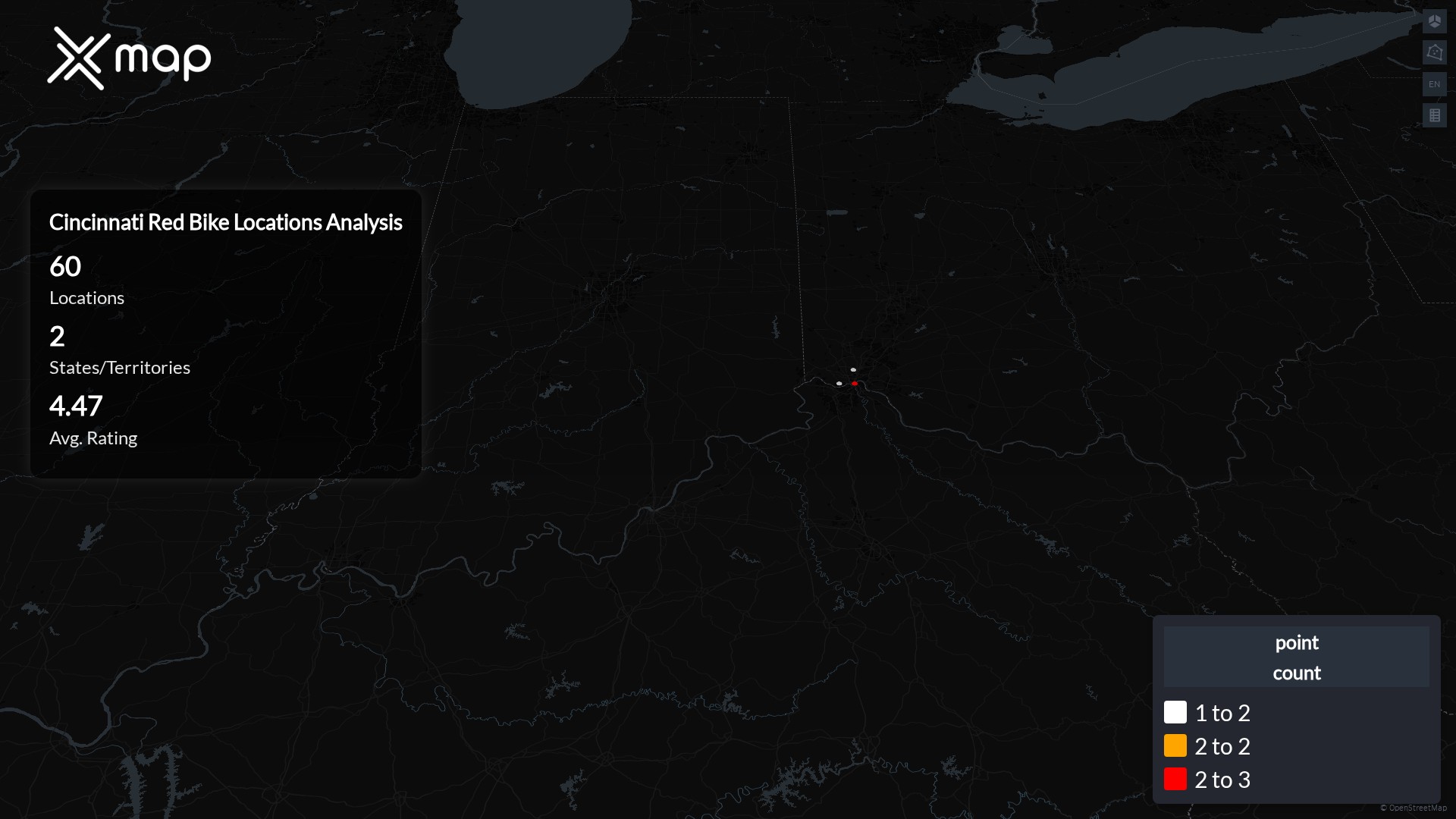 Street-level clusters show corridors where multiple Cincinnati Red Bike locations sit within the same neighborhood indicating strong local presence and coherence. Cincinnati Red Bike operates a total of 60 nationwide.