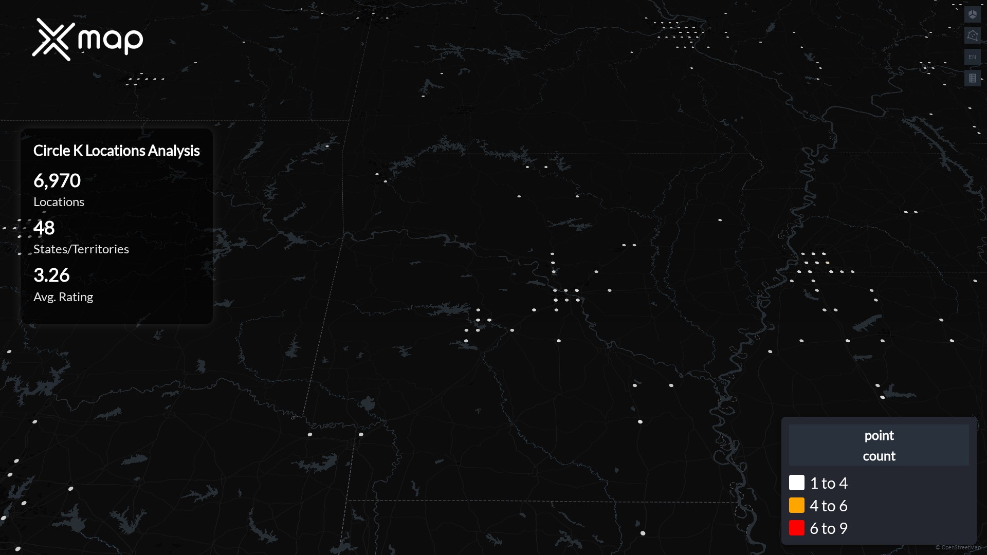 Street-level clusters show corridors where multiple Circle K locations sit within the same neighborhood indicating strong local presence and coherence. Circle K operates a total of 6970 nationwide.