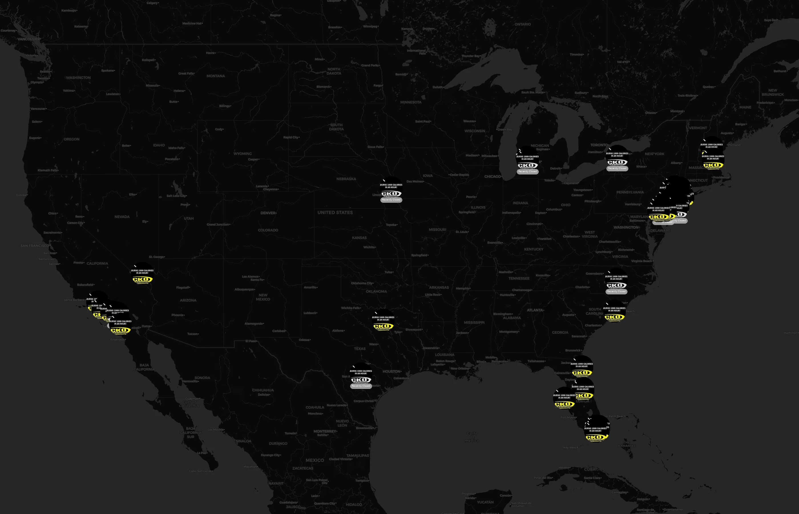 Street-level clusters show corridors where multiple CKO Kickboxing locations sit within the same neighborhood indicating strong local presence and coherence. CKO Kickboxing operates a total of 83 nationwide.