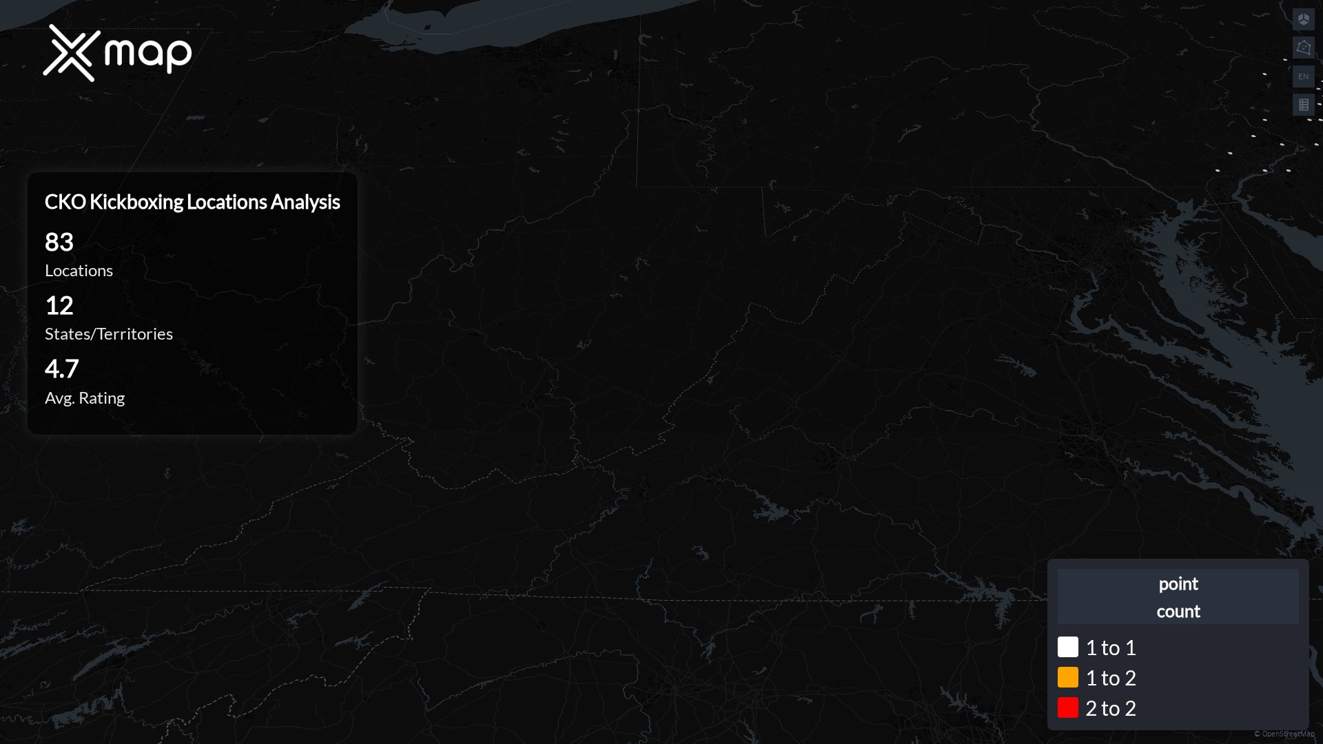 The complete dataset of CKO Kickboxing locations across the United States of America is available for download, including coordinates, traffic patterns, and operational status.