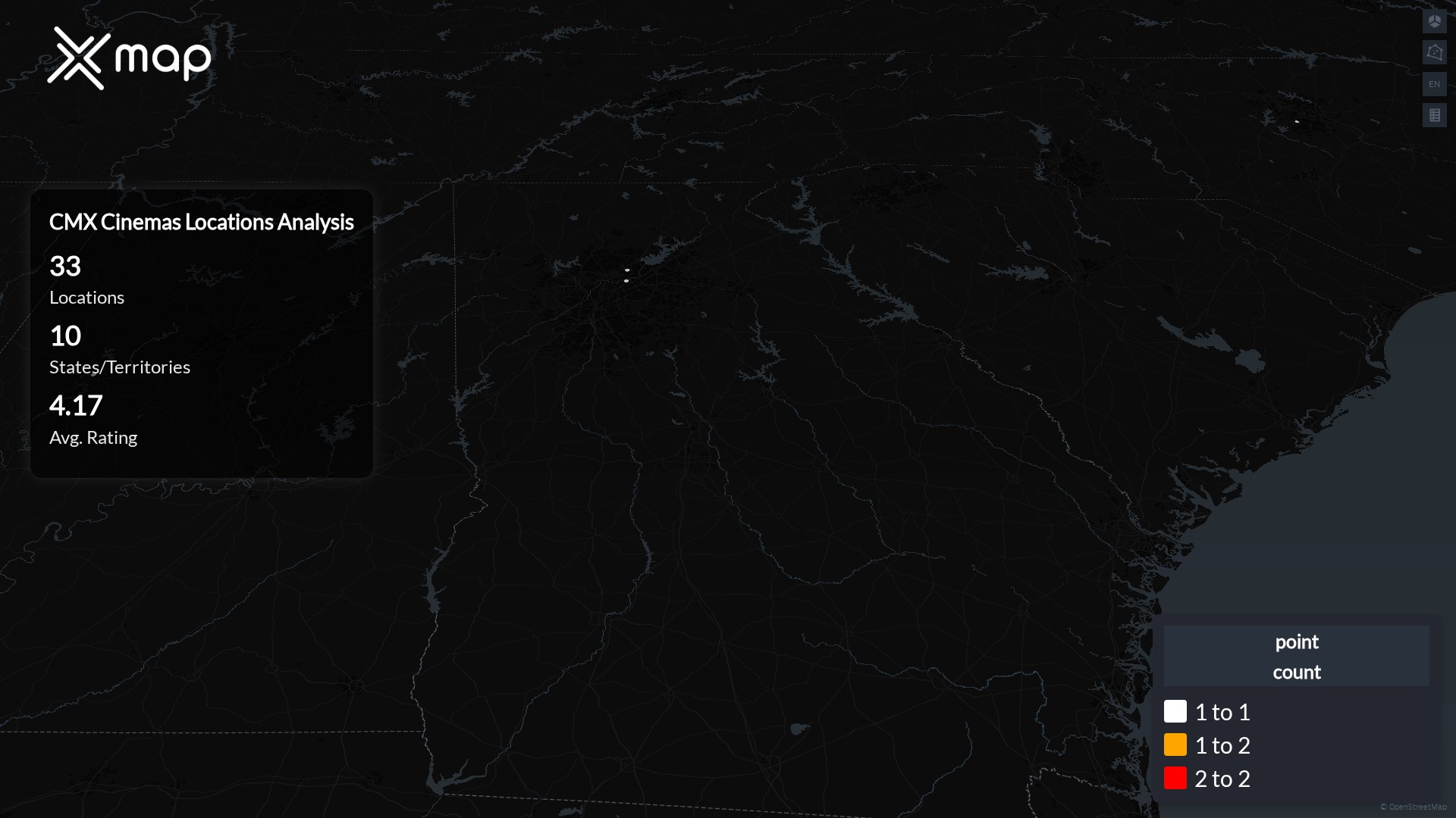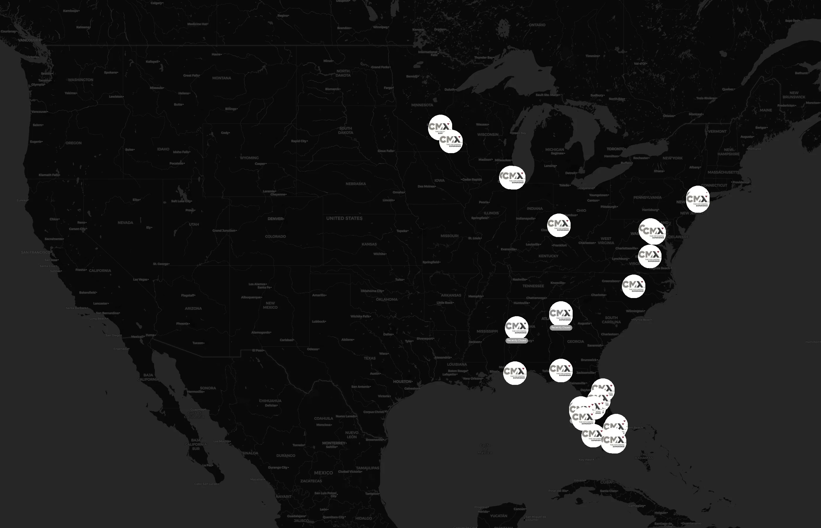 Street-level clusters show corridors where multiple CMX Cinemas locations sit within the same neighborhood indicating strong local presence and coherence. CMX Cinemas operates a total of 33 nationwide.