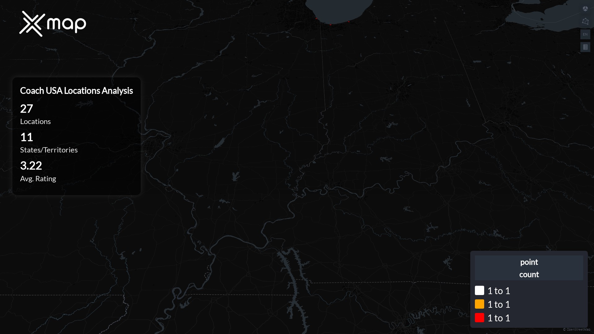 Coach USA POI data enables clear measurement of footprint and demand. Analysts can rank states and cities by location count, compare coverage on a per-capita basis, and use traffic scores and review volumes to spot high-performing markets and under-served pockets. The result is an objective view of saturation, growth opportunities, and performance outliers.