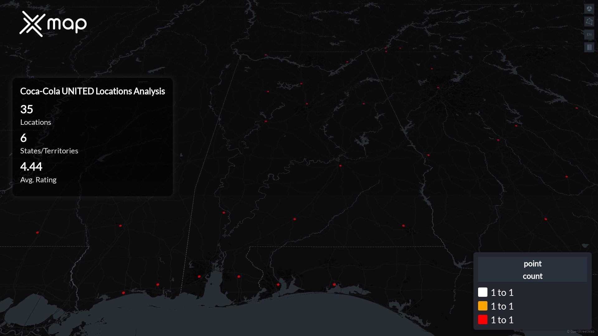 Street-level clusters show corridors where multiple Coca-Cola UNITED locations sit within the same neighborhood indicating strong local presence and coherence. Coca-Cola UNITED operates a total of 35 nationwide.