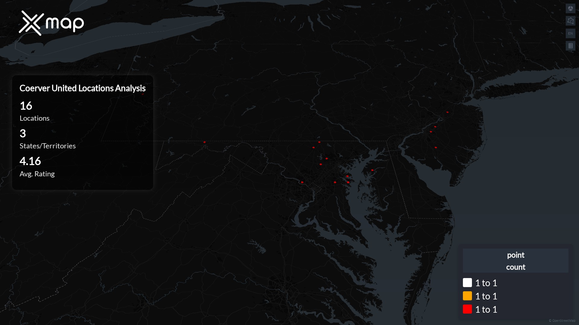 Coerver United operates 16 locations across three states in the United States. New Jersey and Pennsylvania each have all their locations open, with 4 and 1 respectively. Maryland has 11 locations, of which 10 are open, resulting in a 90.9% open rate.