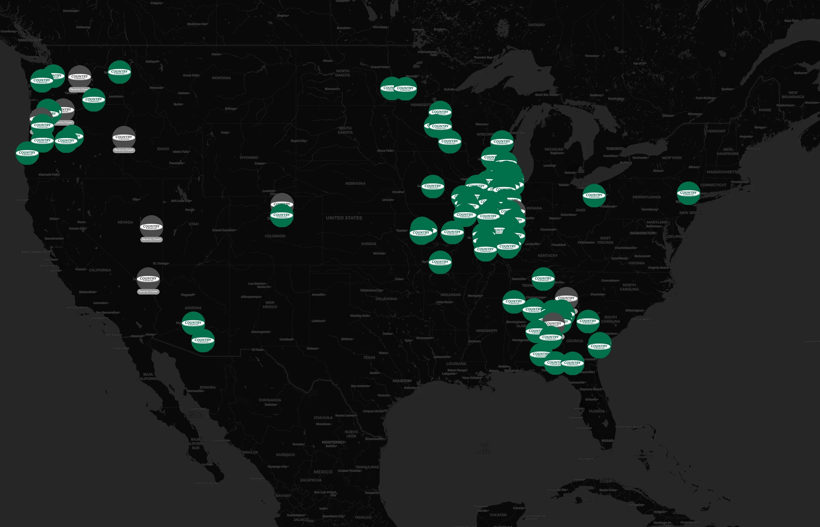 Street-level clusters show corridors where multiple Country Financial locations sit within the same neighborhood indicating strong local presence and coherence. Country Financial operates a total of 137 nationwide.
