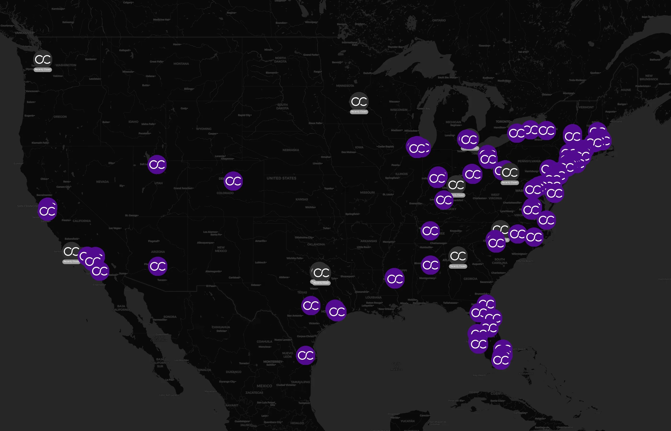 Crown Castle POI data enables clear measurement of footprint and demand. Analysts can rank states and cities by location count, compare coverage on a per-capita basis, and use traffic scores and review volumes to spot high-performing markets and under-served pockets. The result is an objective view of saturation, growth opportunities, and performance outliers.