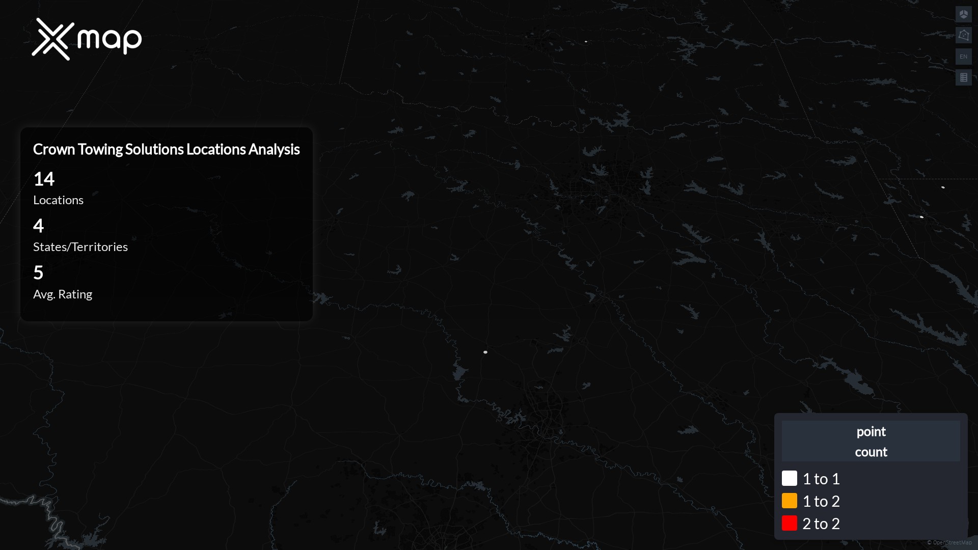 Crown Towing Solutions POI data enables clear measurement of footprint and demand. Analysts can rank states and cities by location count, compare coverage on a per-capita basis, and use traffic scores and review volumes to spot high-performing markets and under-served pockets. The result is an objective view of saturation, growth opportunities, and performance outliers.