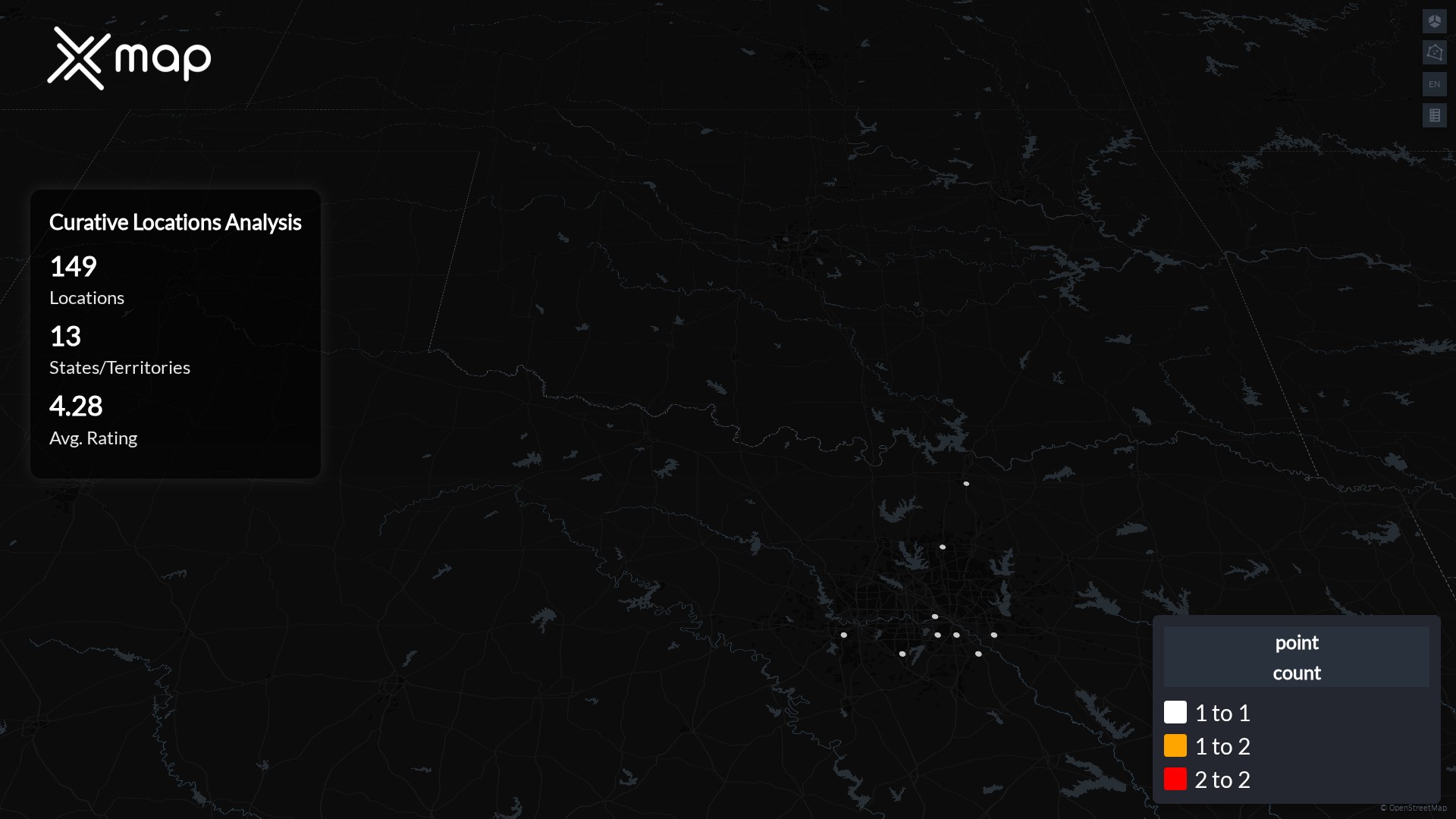 Street-level clusters show corridors where multiple Curative locations sit within the same neighborhood indicating strong local presence and coherence. Curative operates a total of 149 nationwide.